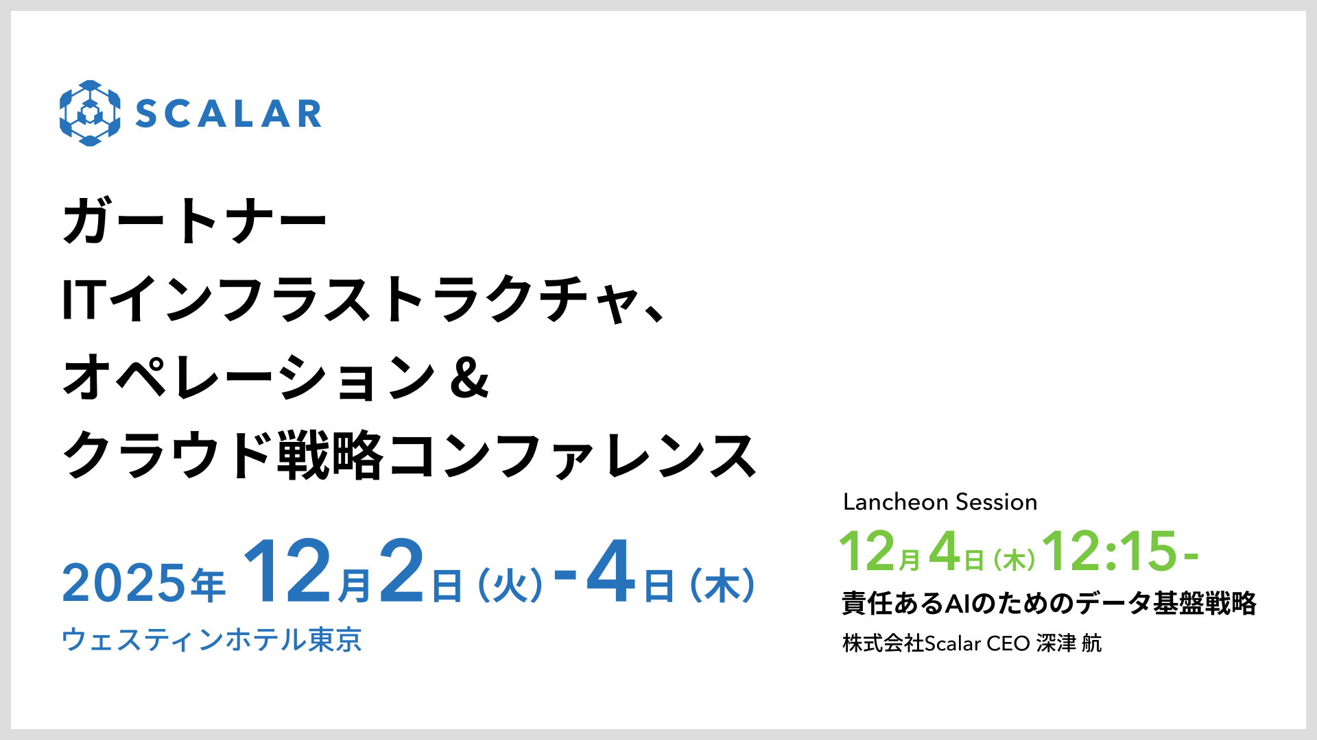 株式会社Scalar(本社:東京都、代表取締役CEO:深津航、代表取締役CTO:山田浩之、以下「Scalar」)は、2025年12月に開催される「ガートナー ITインフラストラクチャ、オペレーション & クラウド戦略コンファレンス」に出展し、展示ブースの出展およびランチョンセッションでの講演を実施いたします。