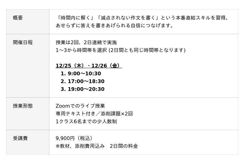 専門講師によるライブ授業と添削指導で合格につながる作文力を身につける! 参加方法:オンライン 小学6年生…2025年12月25日・26日の2日間 / 小学5年生…2026年1月6日もしくは7日