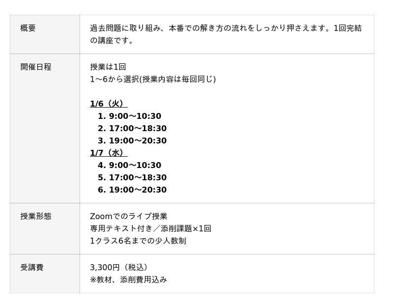 入試作文に必要となる「1.求められているテーマについて書けているか 2.自分の考えを論理的に伝えられているか 3.字数や段落構成は要件を満たしているか 4.日本語として適切な表現か 5.時間内に書きあげられるか」の5つのポイントを押さえながら、「減点されない、得点に結びつく作文を書くテクニック」を身につけ、得点源にする講座です。