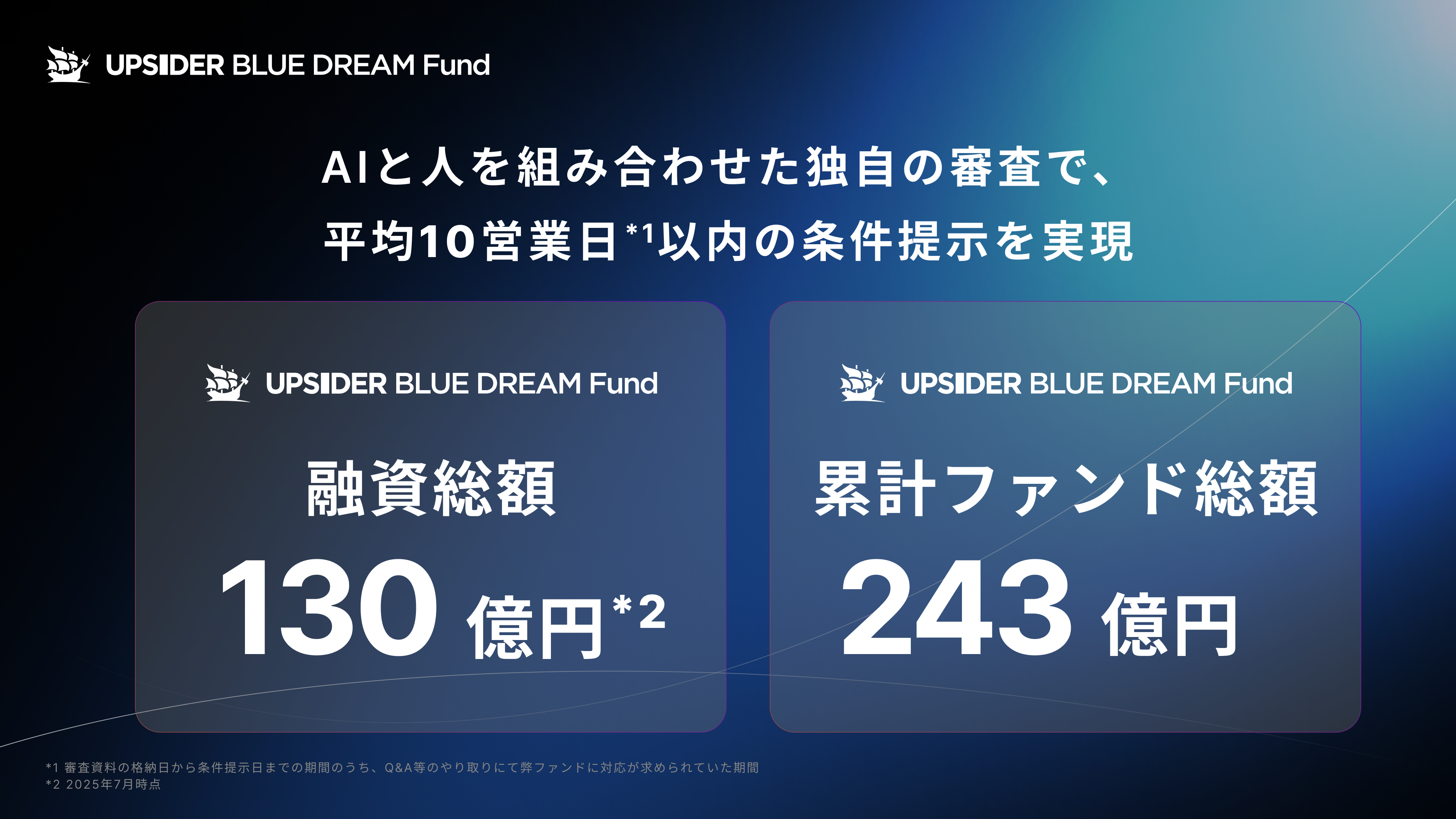 2025年7月には、第2号ファンド「UPSIDER BLUE DREAM Growth Fund 2号」を総額143億円で設立。第1号と合わせ累計243億円規模となり、複数の金融機関・投資家が参画する独立系ベンチャーデットファンド*6として国内最大規模*7となりました。地方銀行や保険会社の参画により、幅広い企業への資金供給体制も強化しています。
