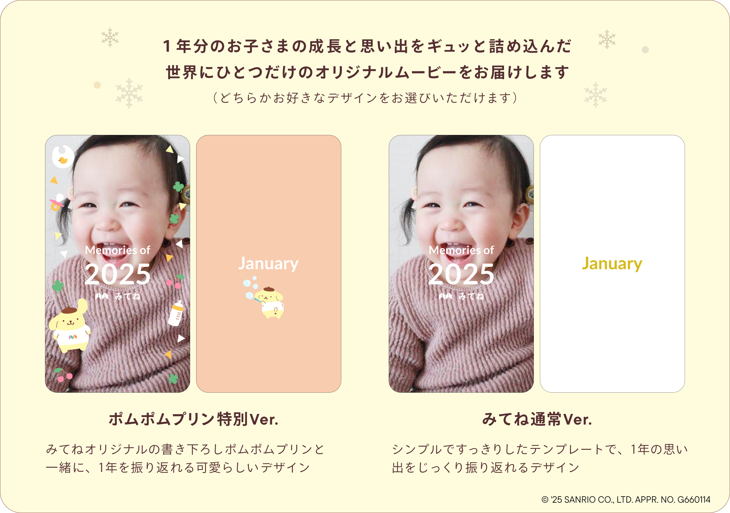 今回のコラボレーションでは、「2025年サンリオキャラクター大賞」で1位に輝いた「ポムポムプリン」が動画のオープニングや月ごとの切り替わり画面などに登場し、1年間の大切な思い出を可愛らしく彩ります。