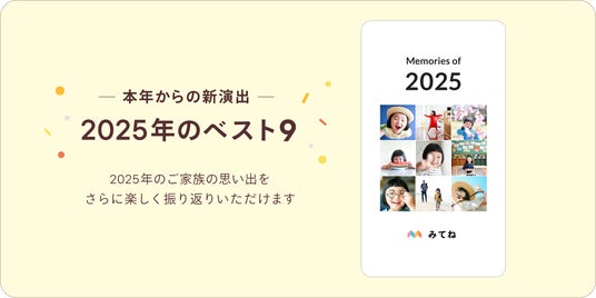 「年間版1秒動画」は、有料プラン限定で提供される、1年間の思い出を振り返る年末年始の特別なムービーです。1年間の膨大な写真・動画から年間版として改めて一本の動画を自動で作成します。2025年版からは、新演出として、1年間で閲覧数の多かった写真・動画から選ばれて表示される「2025年ベスト9」も登場し、一年の家族の思い出をふりかえるきっかけとして楽しめます。