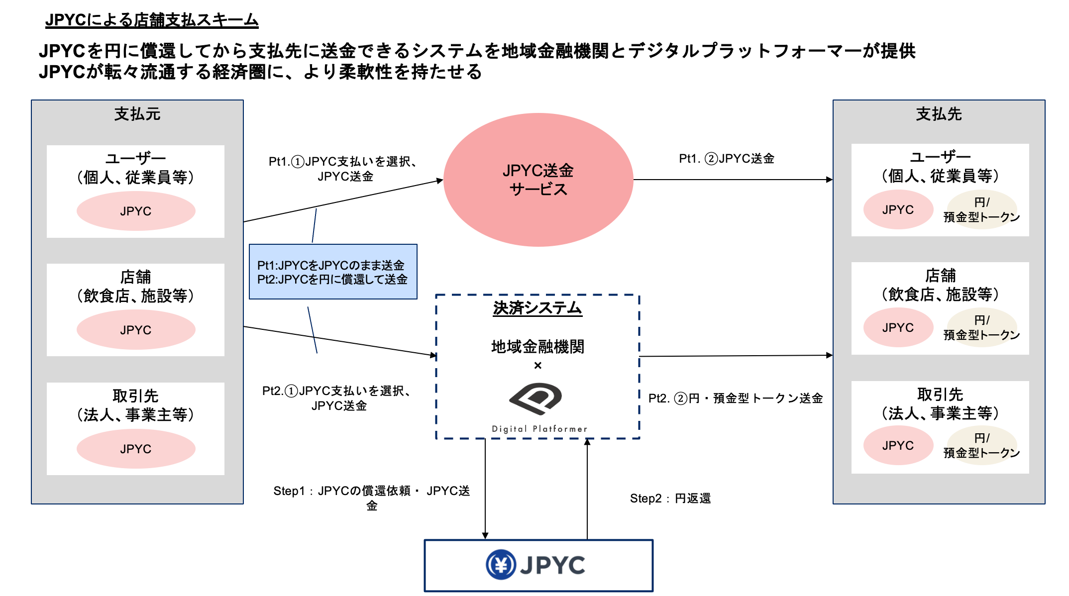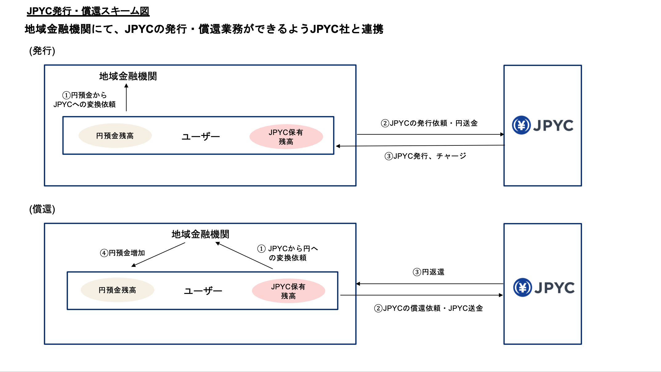 一方、JPYCは資金移動業型の日本円建てステーブルコイン「JPYC(ジェーピーワイシー)」の発行を開始し、全国の地方金融機関から、JPYCの発行や償還、決済インフラとの接続に関する相談が寄せられています。
