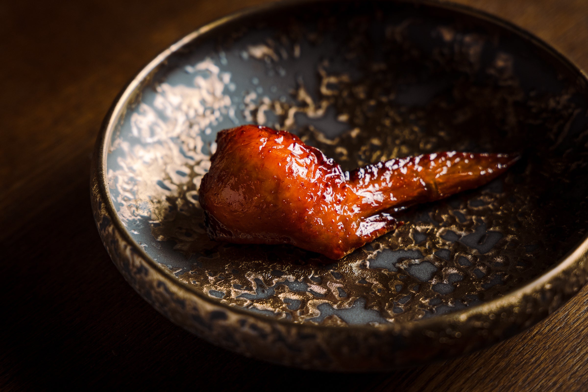 山梨県産の信玄鷄手羽先の中に、カシューナッツと麹を使ったフォアグラの代替食材「ヴィーガンフォアグラ」を詰め、塩麹のタレに漬け込みました。