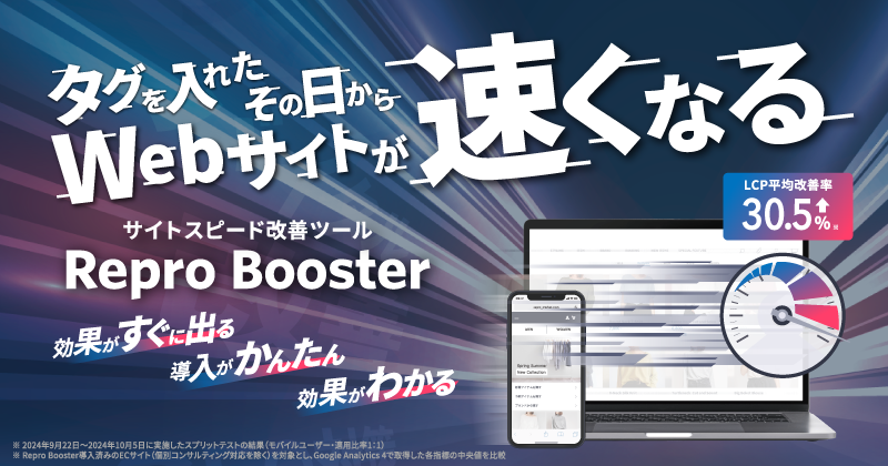「Repro Booster」は、Webサイトの表示速度を向上させ、収益を最大化するサイトスピード改善ツールです。「ランディング高速化機能(β版)」、特許技術※を用いた「ページ回遊高速化機能」、そして購入・申し込みを後押しする「カート&フォームページ高速化機能」を搭載。