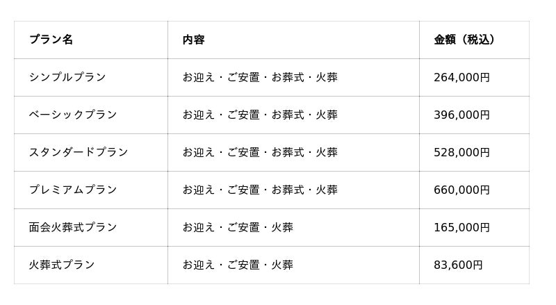 新たな料金プランを導入し、明確でわかりやすい料金体系を整備いたしました。ご希望に合わせて、火葬式から1日葬まで6つのプランをご用意。当日はもちろん、事前相談も専任スタッフが丁寧にサポートし、安心してお任せいただけます。また、ご希望に応じてお通夜をはじめとしたさまざまなお見送りのかたちにも対応しており、故人様やご家族の想いに寄り添ったご提案をいたします。