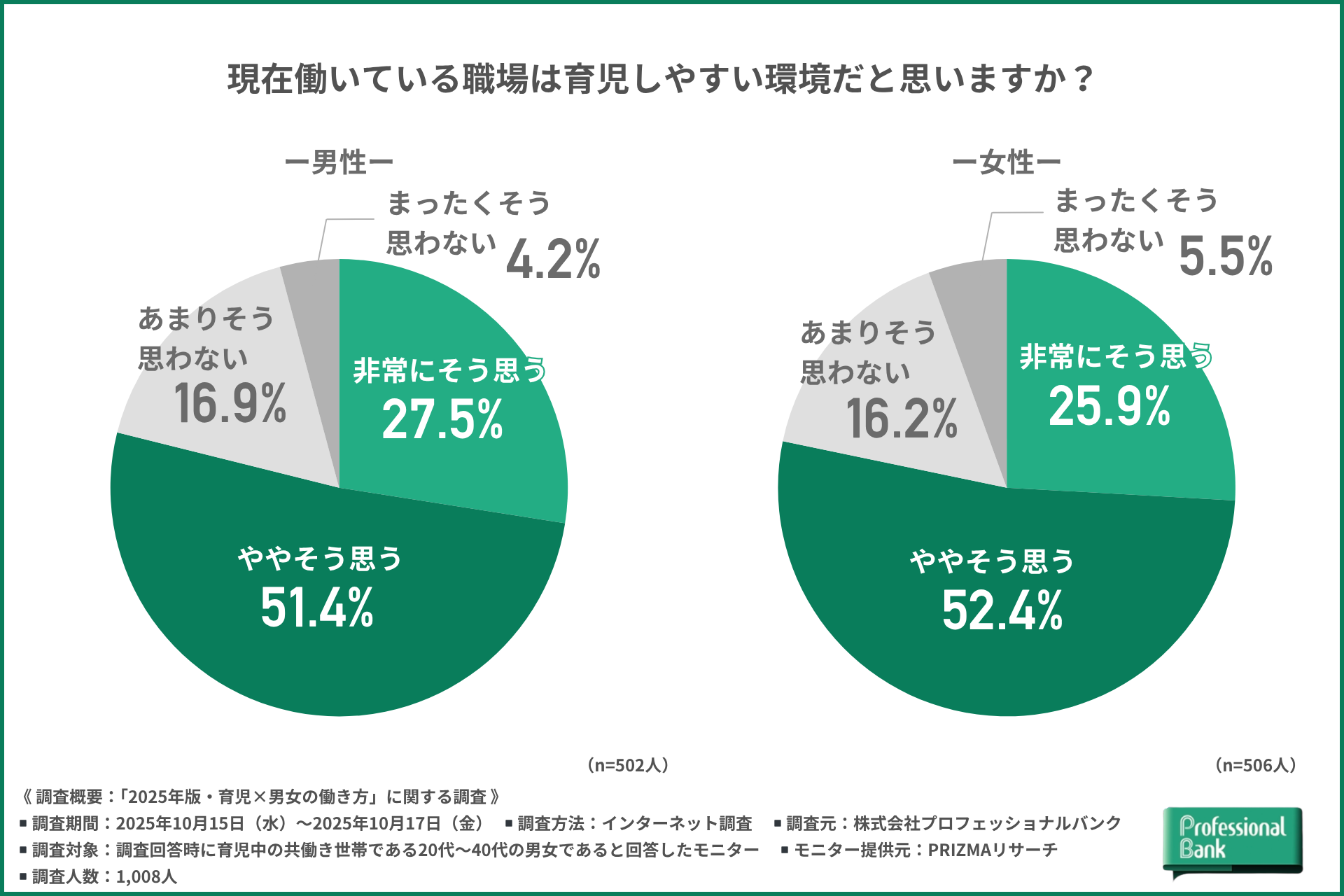 株式会社プロフェッショナルバンク(本社:東京都千代田区、代表取締役:呑田 好和)のHR研究所は、11月19日の【いい育児の日】に向けて、育児中の共働き世帯である20代~40代の男女を対象に、「2025年版・育児×男女の働き方」に関する調査を行いました(有効回答数:1,008人)。