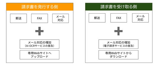 2023年のインボイス制度の施行、2024年の電子帳簿保存法の改正に伴い、請求書のデジタル化が加速する一方で、現在の市場には多様な請求書発行・受取サービスが存在しています。このような状況において、企業の経理担当者は、従来の紙でのやり取りに加え、メールでのPDF送付、専用Webサイトへのアップロード、FAXでの対応など、請求書を発行する側と受け取る側、それぞれが相手の希望する方法に合わせる必要があり、単純作業に多くの時間を費やしています。