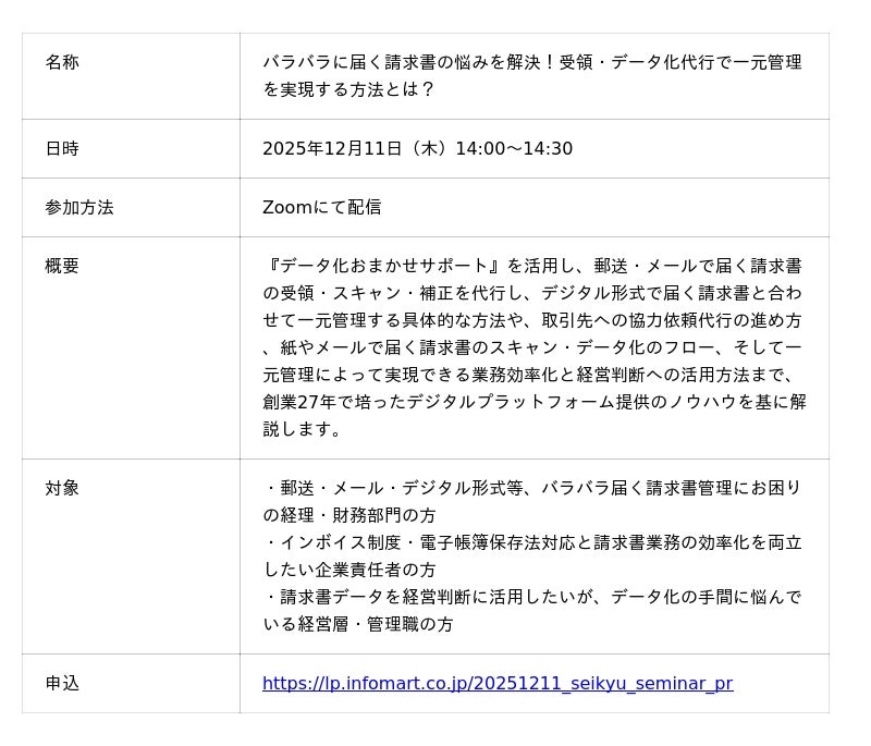 デジタルの力であらゆる業務を効率化する株式会社インフォマート(本社:東京都港区 代表取締役社長:中島 健、以下「当社」)は、郵送やメールで届く請求書の受領代行を行う新サービス『データ化おまかせサポート』の提供を2026年1月より開始します。本サービスは、当社が提供する請求書クラウドサービス「BtoBプラットフォーム 請求書」のオプションサービスとして提供します。
