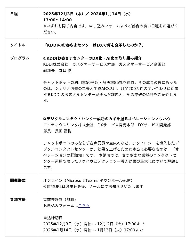 アルティウスリンク株式会社(所在地:東京都渋谷区、代表取締役社長:那谷 雅敏、以下 アルティウスリンク)は、KDDI株式会社と2025年12月3日(水)・2026年1月14日(水)にKDDI共催オンラインセミナー「KDDIのお客さまセンターはDXで何を変革したのか?」を開催します。