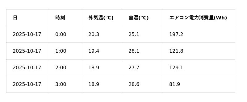 - 2025年10月17日(金)~10月30日(木)の2週間、午前0時台から午前3時台まで1時間単位で、エアコンの電力消費量、室温(Nature Remo Lapisで計測)、外気温(気象庁発表の神奈川県小田原市の1時間気象データ)の値を測定・収集しました。