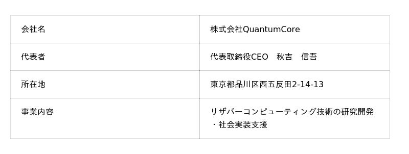 株式会社QuantumCore(本社:東京都品川区、代表取締役CEO:秋吉信吾、以下「当社」)は、国立研究開発法人新エネルギー・産業技術総合開発機構(NEDO)が2025年8月から公募を実施した「リザバーコンピューティング技術の有効性検証に関する技術調査」において、採択先として選定されましたことをお知らせいたします。「リザバーコンピューティング技術の有効性検証に関する技術調査事業」に係る実施体制の決定について