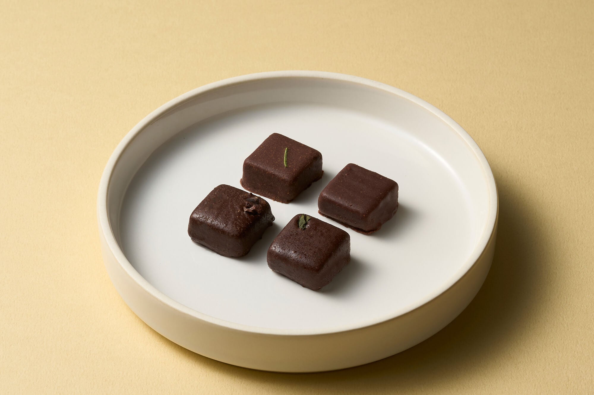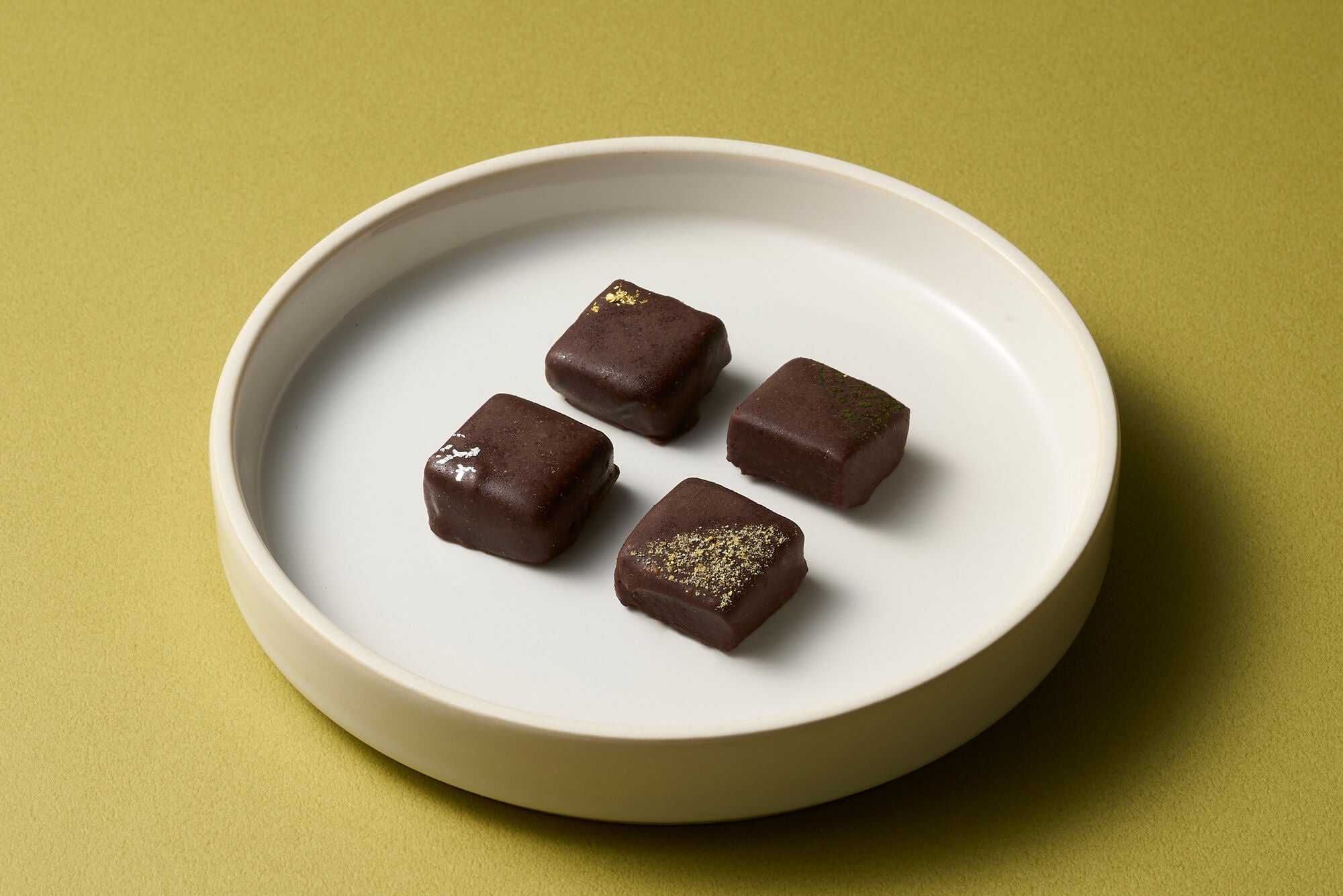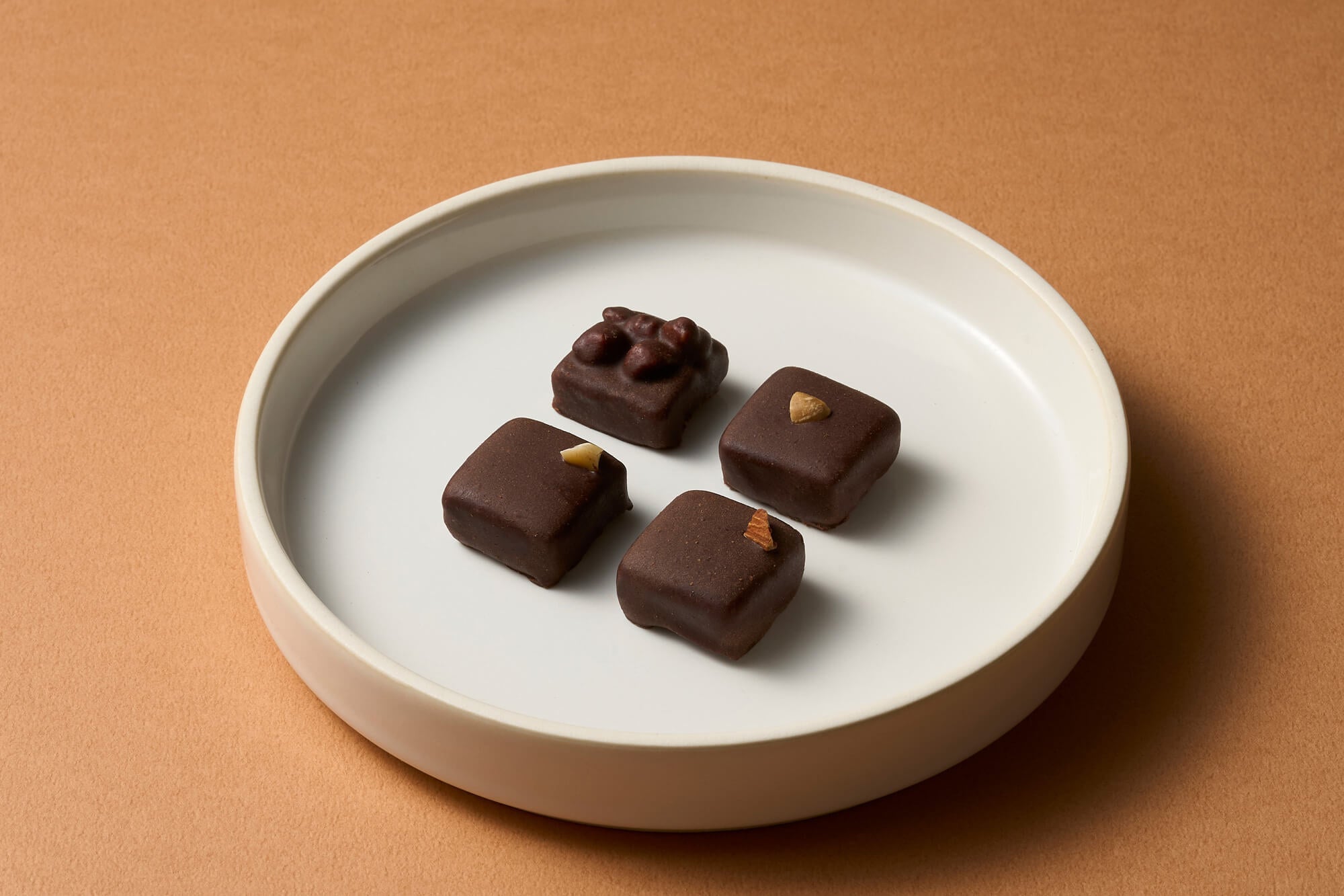 使用するチョコレートは、素材との調和を追求し、カカオ豆の選定から一つひとつ丁寧に仕立てています。産地や焙煎度合い、カカオ濃度まで細やかに検討を重ね、素材の魅力を最大限に引き出す風味を造り上げました。職人の繊細な調整によって、素材とチョコレート、それぞれの個性がひと粒の中で見事に響き合います。