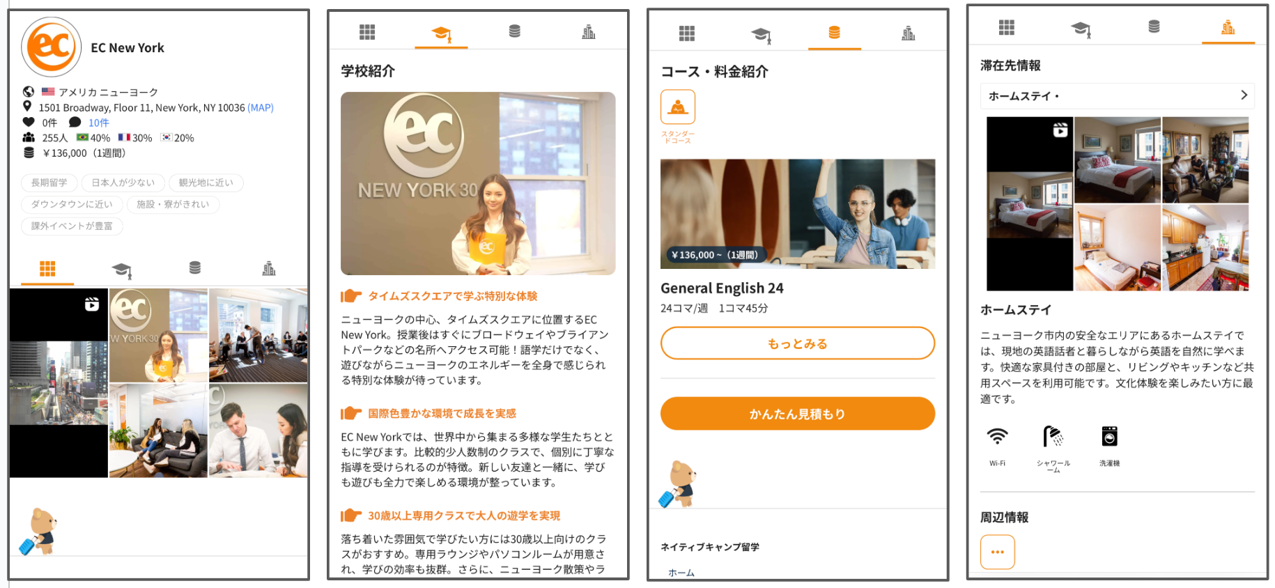 ネイティブキャンプ留学では、ユーザーが必要な情報を分かりやすく把握できるよう、常に丁寧で明確な情報提供を心がけています。ECの詳細情報は、以下の4つのカテゴリーに分けて掲載しており、知りたい情報を的確にお届けします。