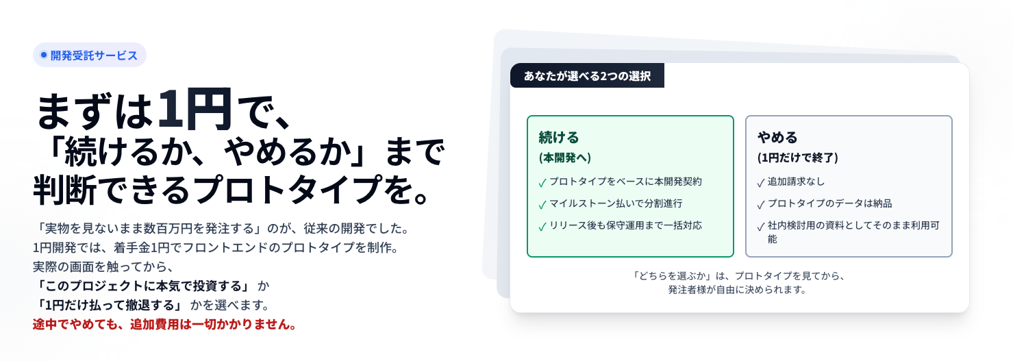 『1円開発』は、あくまで「本開発に進むかどうかを判断するための入り口」として設計されたサービスです。