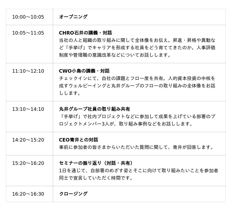 丸井グループ代表取締役社長の青井をはじめ、経営陣が直接講師として当社の「人的資本経営」の取り組みをご説明したうえで、参加者の皆さまと対話をさせていただきます。