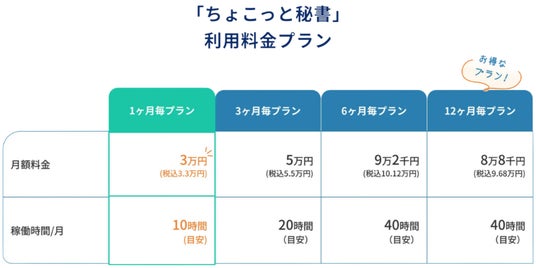 翌月解約できる1ヶ月毎更新プラン、専門分野に強いプレミアムプラン、即依頼、即対応が出来るチーム対応プラン等のプランのご用意もございます。詳細はちょこっと秘書HPをご覧ください。