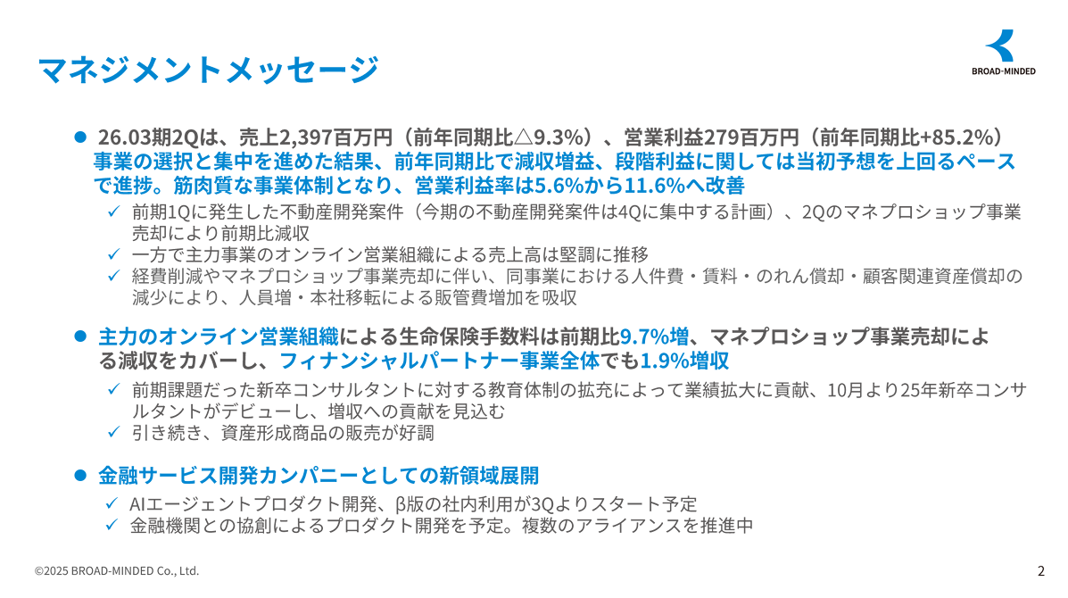 「金融の力を解き放つ」をパーパスに掲げ、ライフプラン実現を支援する金融サービスの開発・提供を手掛けるブロードマインド株式会社(本社:東京都渋谷区 代表取締役社長:伊藤清 証券コード:7343 以下:当社)は、投資家の皆さまに対するIR活動の一環として、2025年11月13日(木)に実施した2026年3月期第2四半期(中間期)決算説明会の動画及び書き起こし記事を公開いたしました。