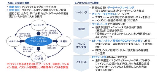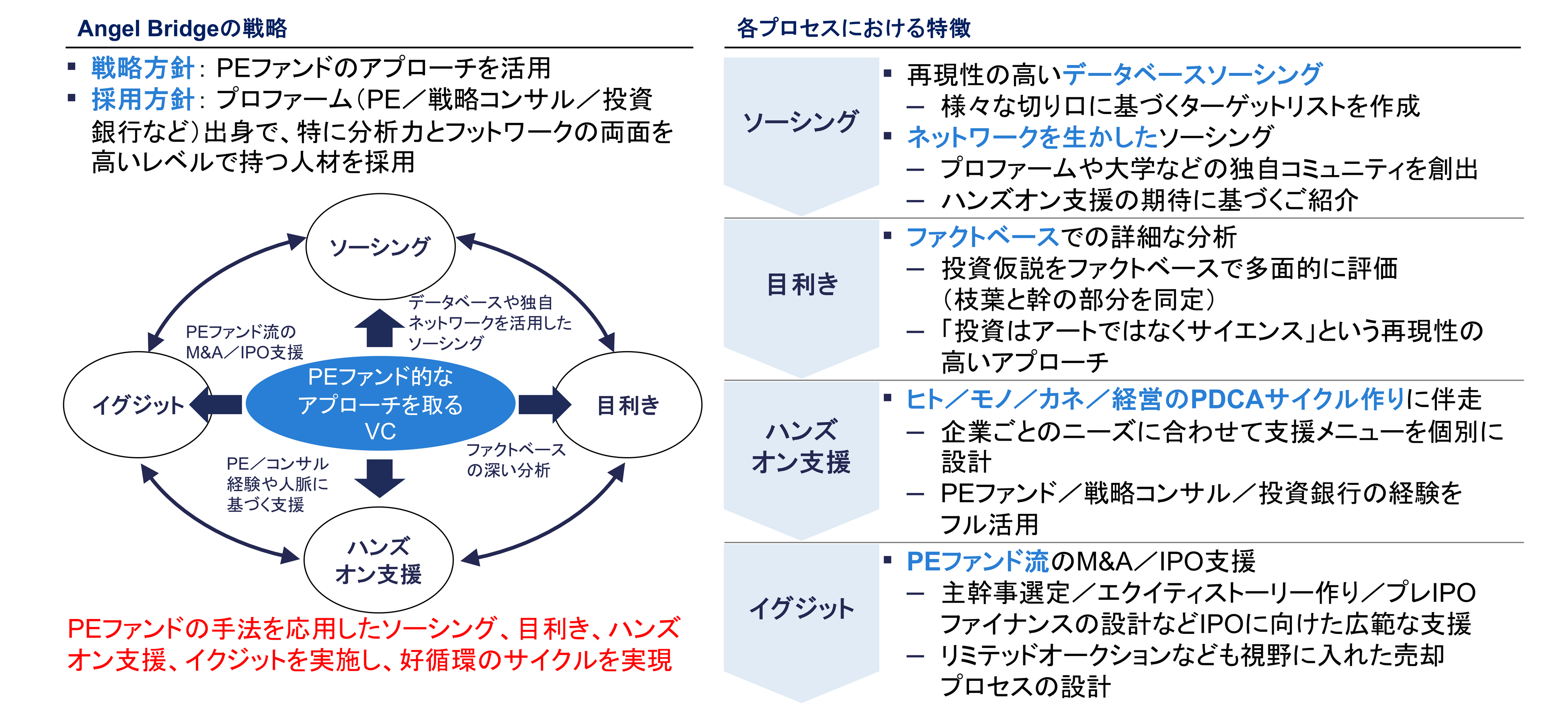 Angel Bridgeの投資活動は、ソーシング/目利き/ハンズオン支援/イグジットにPEファンド的アプローチを取り入れていることを特徴としています。ファクトベースの深い事業分析を行い、優良案件へ大きくかつ継続的に投資をし、企業価値最大化に向けたハンズオン支援を行います。世界トップクラスのプロフェッショナルファームにおける経験を持つメンバーで構成されたチームは、高い分析力とフットワークを強みに、潜在投資先を見つけ、論理的かつ情熱的なコミュニケーションで起業家・投資先の支援に尽力します。
