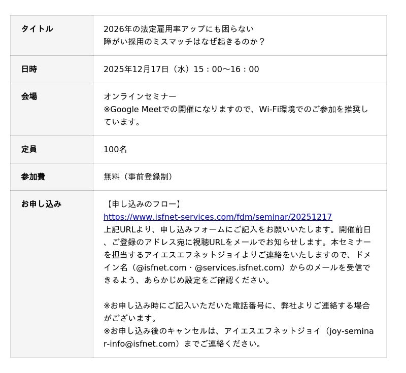 株式会社アイエスエフネットジョイ(本社:東京都新宿区、代表取締役:渡邉幸義、以下アイエスエフネットジョイ)は、2025年12月17日(水)の日程にて障がい者雇用セミナー「2026年の法定雇用率アップにも困らない|障がい者採用のミスマッチはなぜ起きるのか?」を開催いたします。