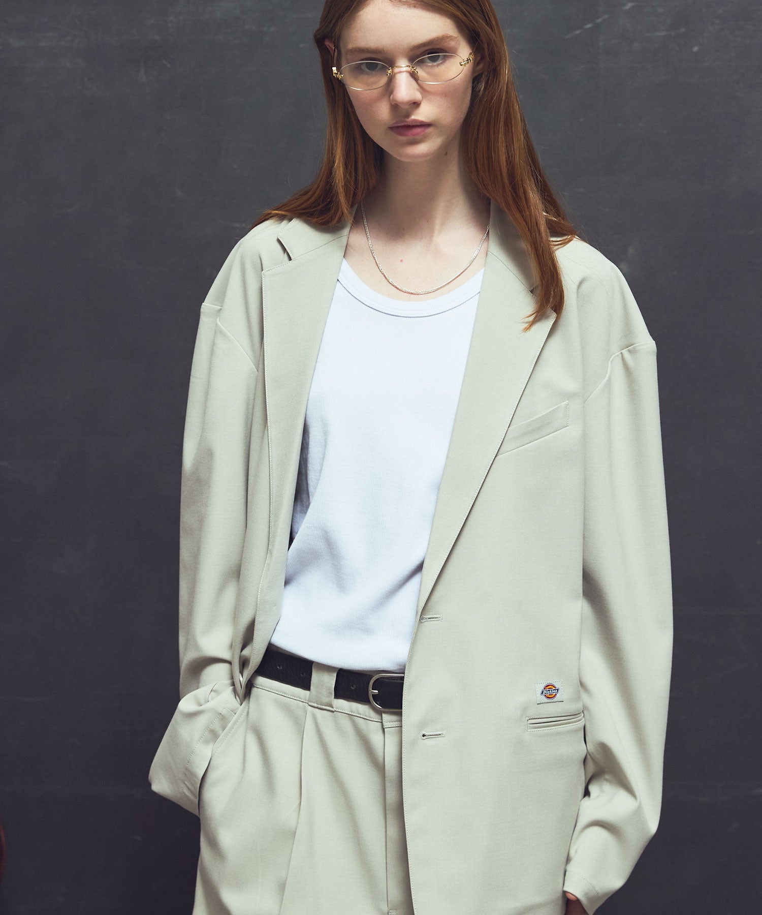 パンツはDickiesの代表アイテムであるワークパンツモデル874をベースにしつつ、ワイドなシルエットに別注し、こちらも上品な佇まいに。