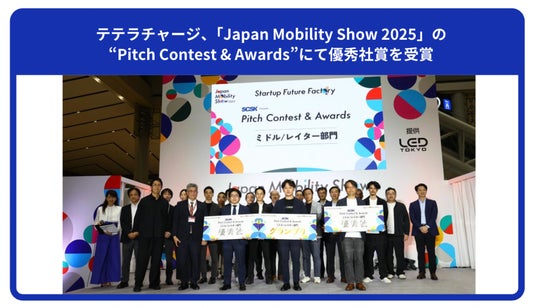 電気自動車(EV)向け充電サービス「Terra Charge(テラチャージ)」を展開するTerra Charge 株式会社(本社:東京都港区、代表取締役社長:徳重徹、以下当社)は、2025年10月31日に開催された「Japan Mobility Show 2025」内スタートアップ共創プログラム「Startup Future Factory」のPitch Contest & Awardsにおいて、応募数118社の中からミドル/レイター部門の優秀社賞を受賞いたしました。