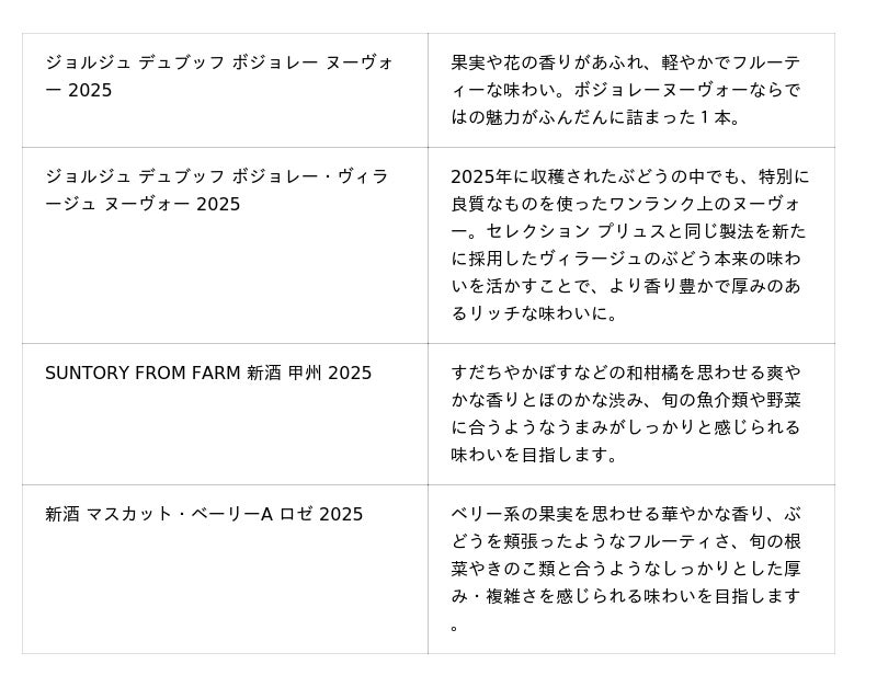 “生まれたて”だけを集めた飲み比べ。今年は〈ボジョレー〉と〈サントリー「FROM FARM」〉の二本立て。香りの階段を上るように味わうセレクションです。