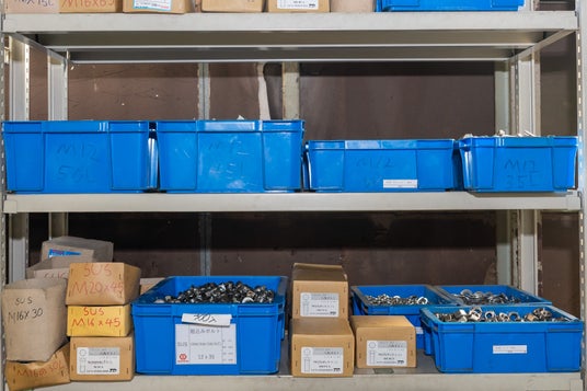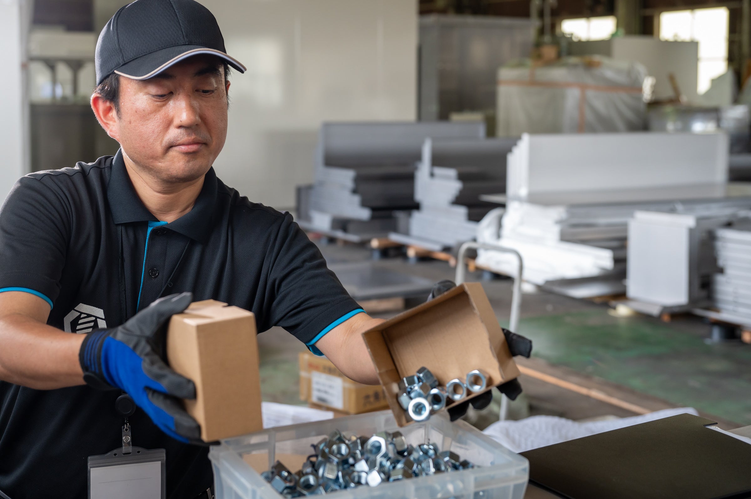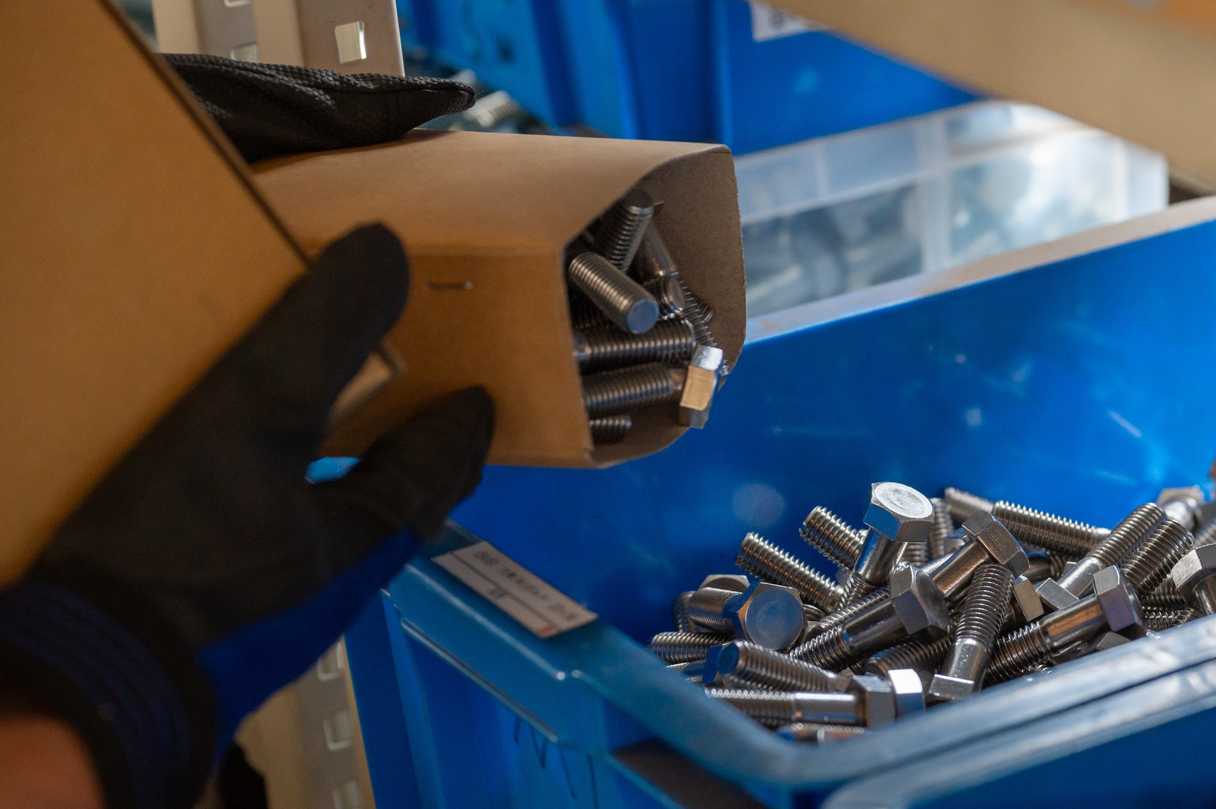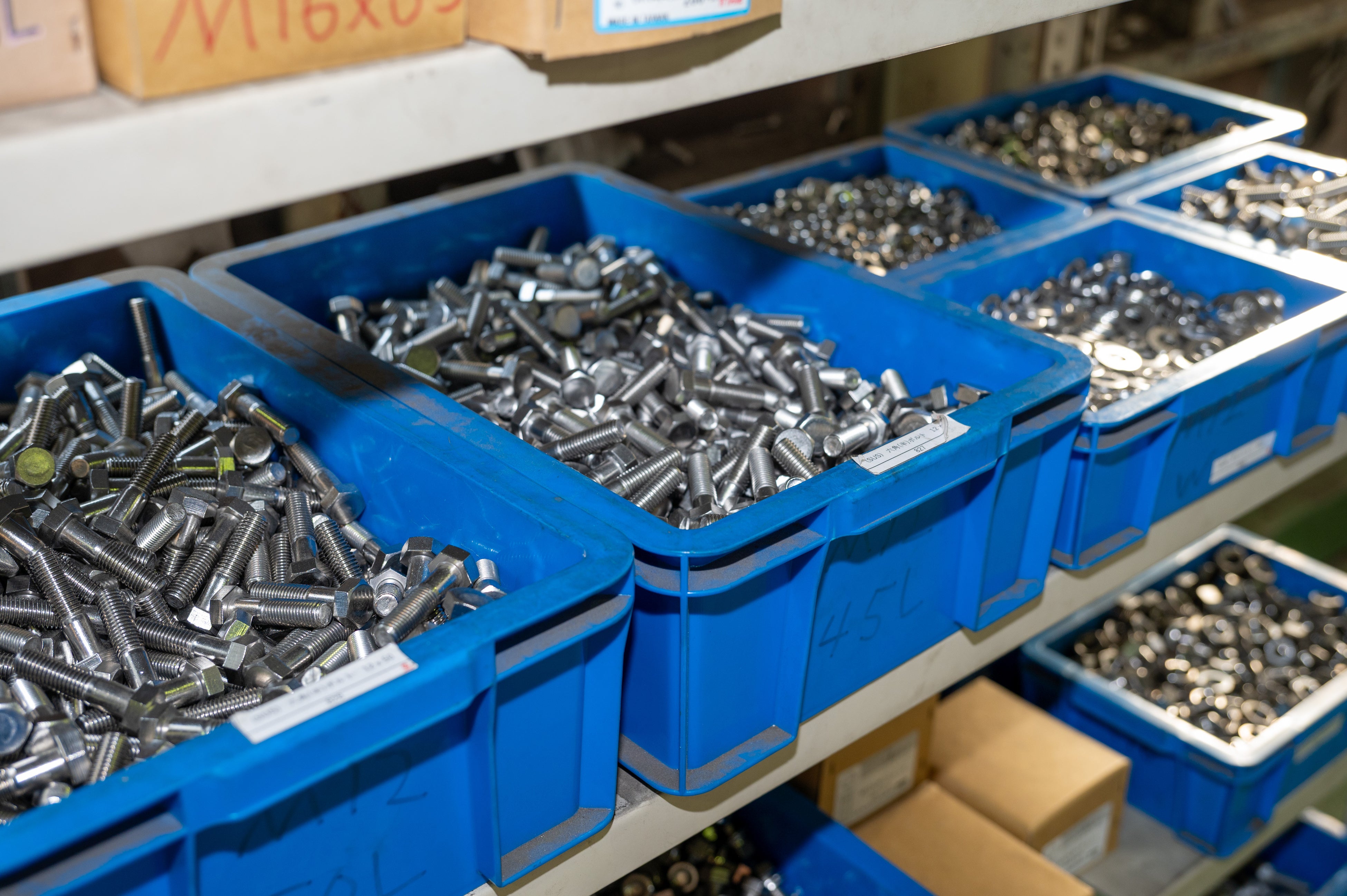 「棚へボルトを補充する作業風景。定期チェックで在庫を切らさない仕組みを支える工程」