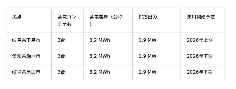 今回採用された蓄電システムは、岐阜県下呂市、愛知県瀬戸市、岐阜県高山市の3拠点に設置され、2026年から順次運転を開始する予定です。各拠点は中部エリアの電力系統に接続され、電力の余剰時には充電を行い、不足時には放電することで、電力需給バランスの安定化を図ります。