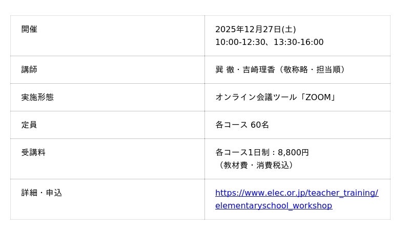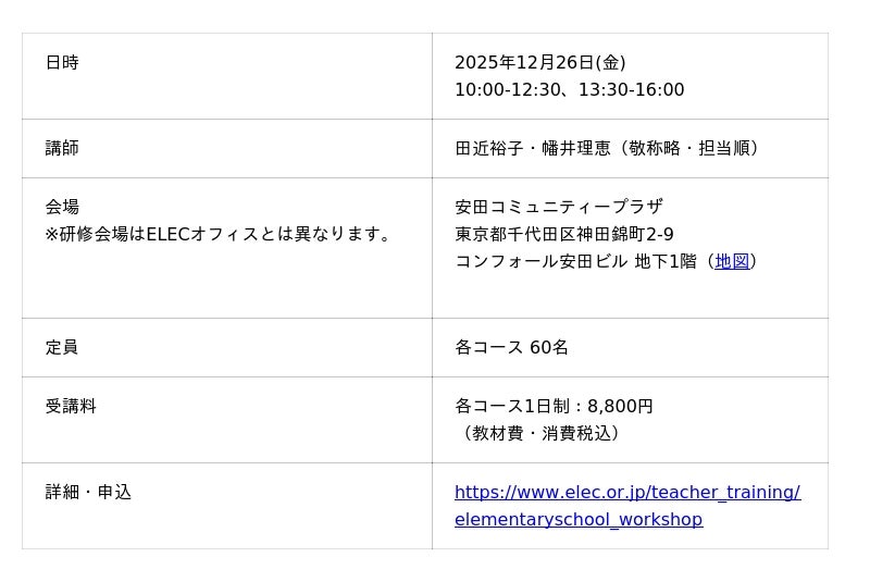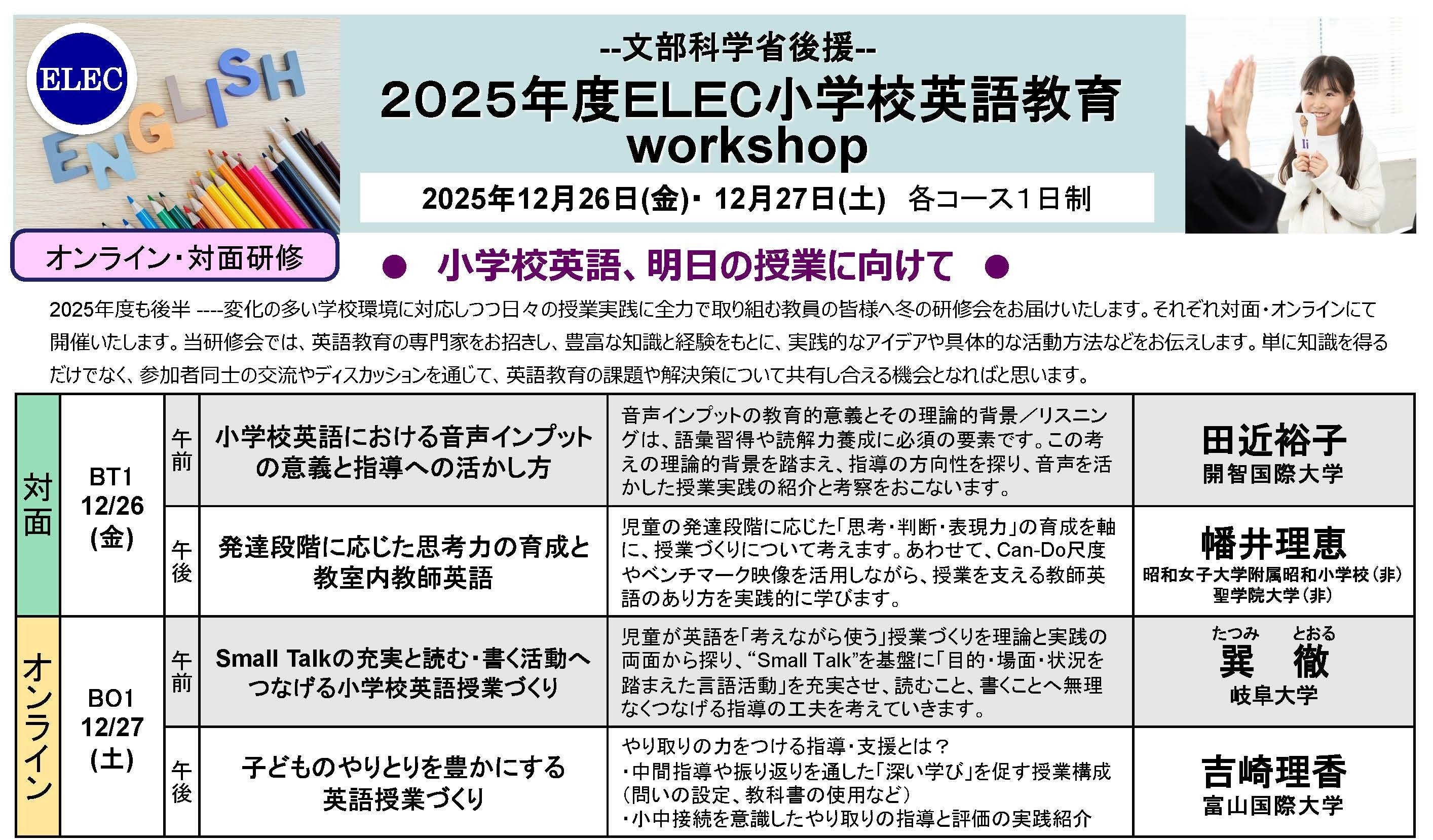 ◆文部科学省後援 2025年度ELEC小学校英語教育workshop(冬期) ◆