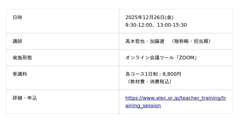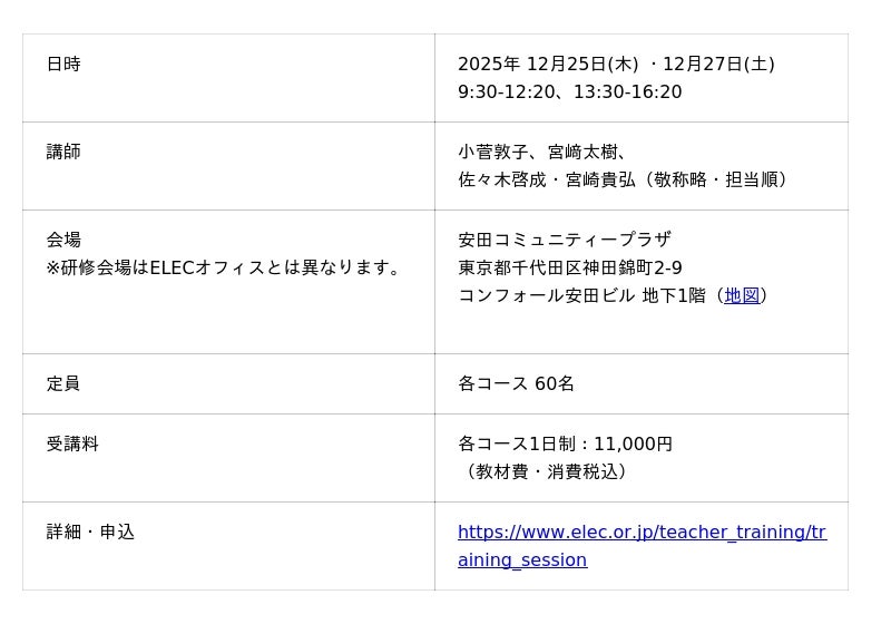 一般財団法人英語教育協議会 (所在地:東京都千代田区、理事長:赤阪清隆、以下「ELEC」)は、 冬休み期間に英語教育研修会を開催します。