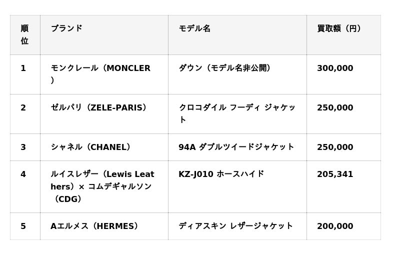 - アウター単品買取額ランキング(高額順 TOP5)
