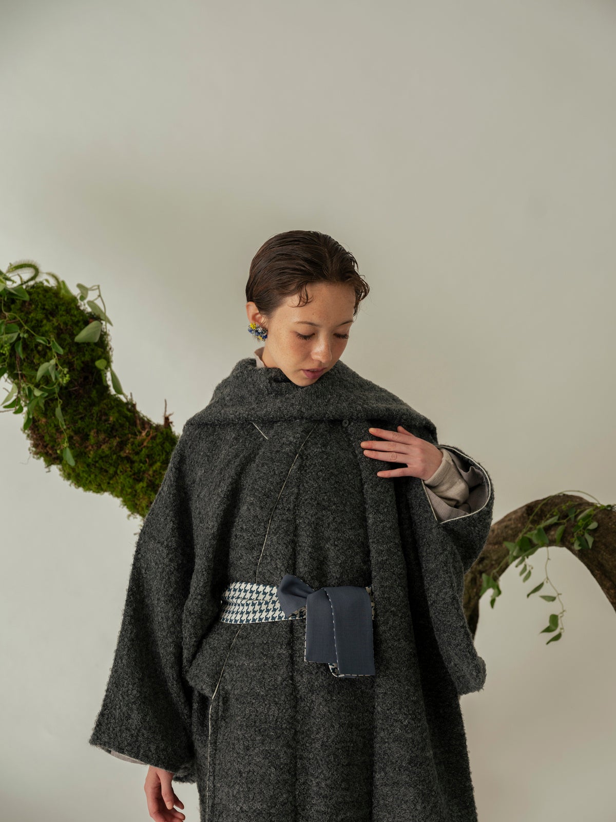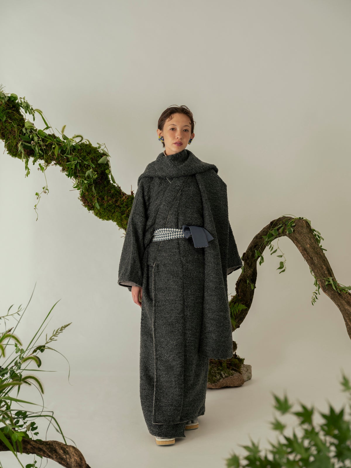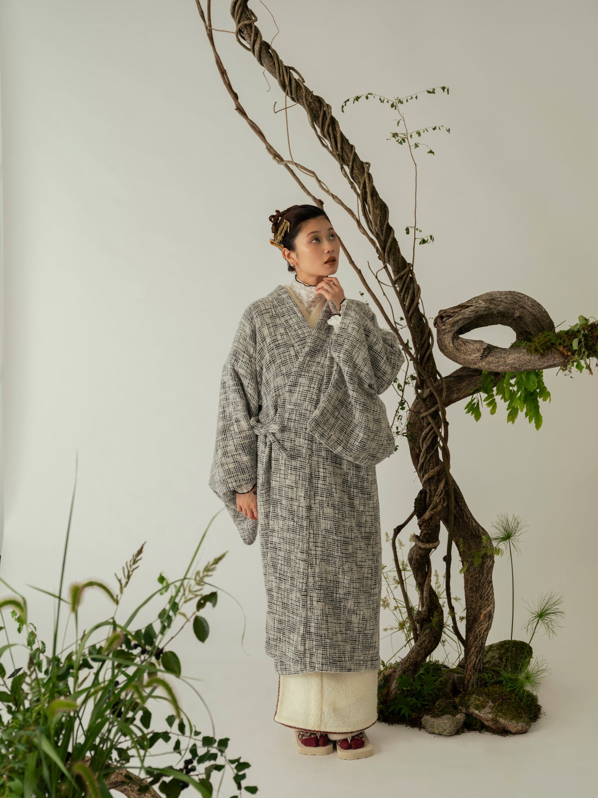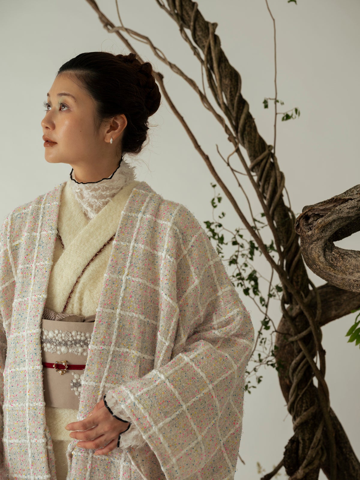 Homespun seriesジャケットなどに用いられるツイード生地を使用したきものと、きものに合わせるコート「道中着」を製作。