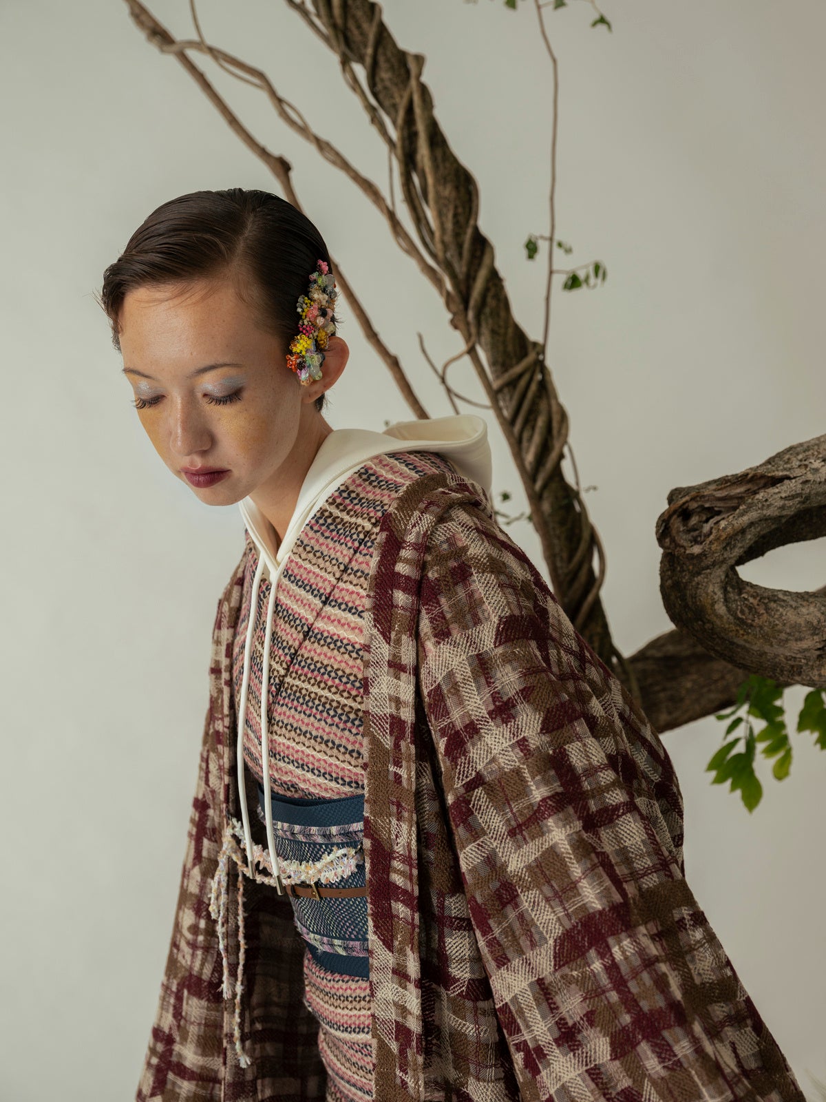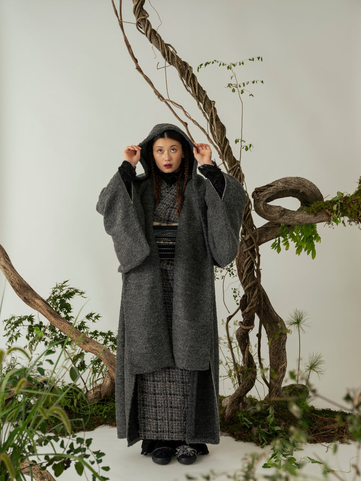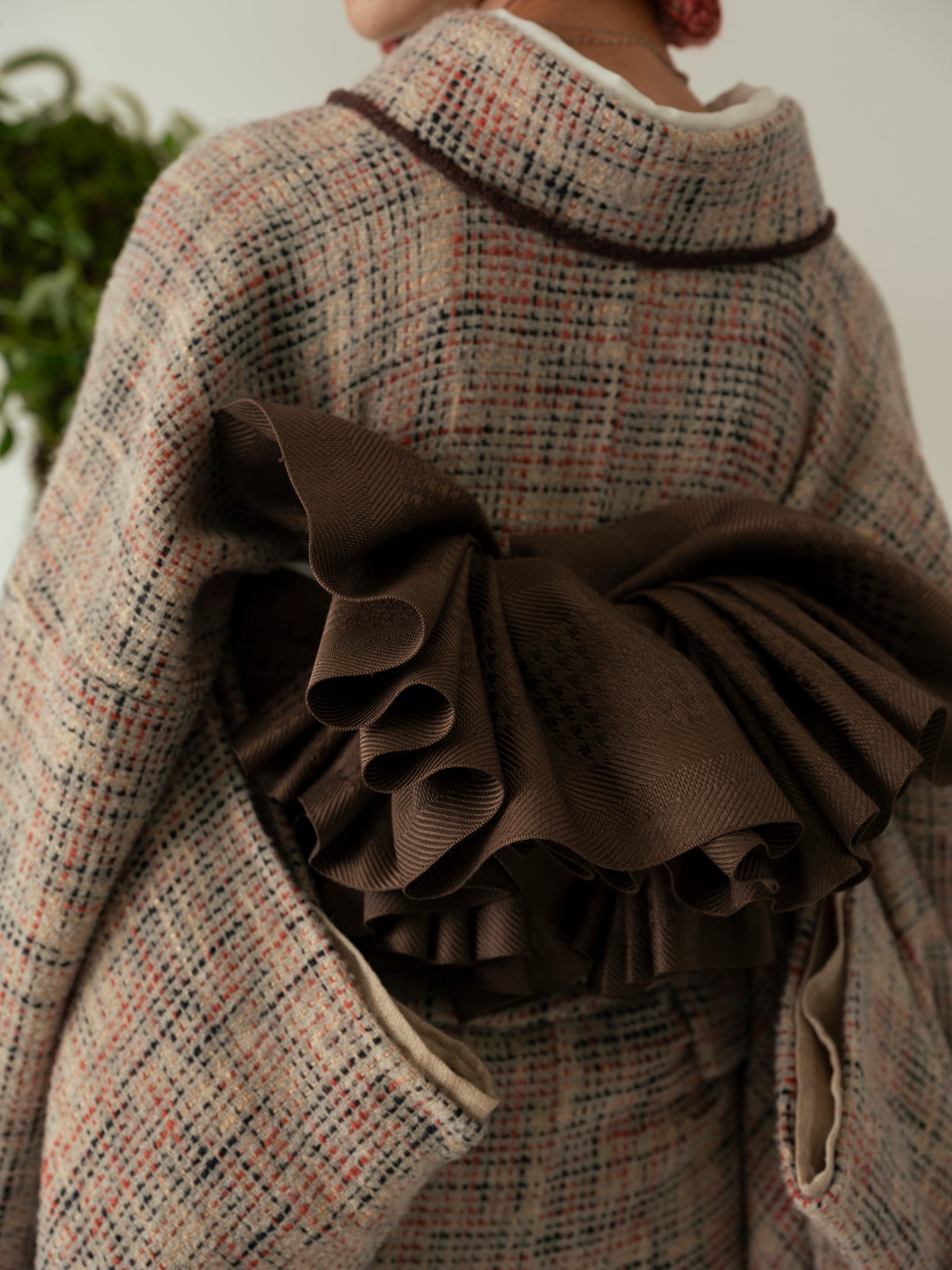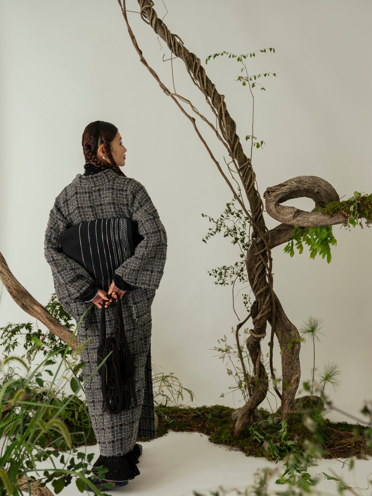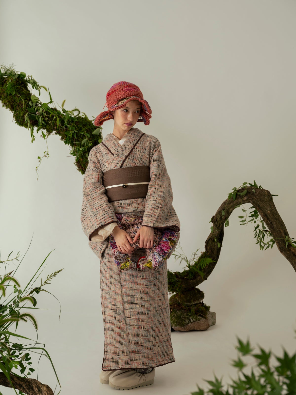 Homespun seriesジャケットなどに用いられるツイード生地を使用したきものと、きものに合わせるコート「道中着」を製作。