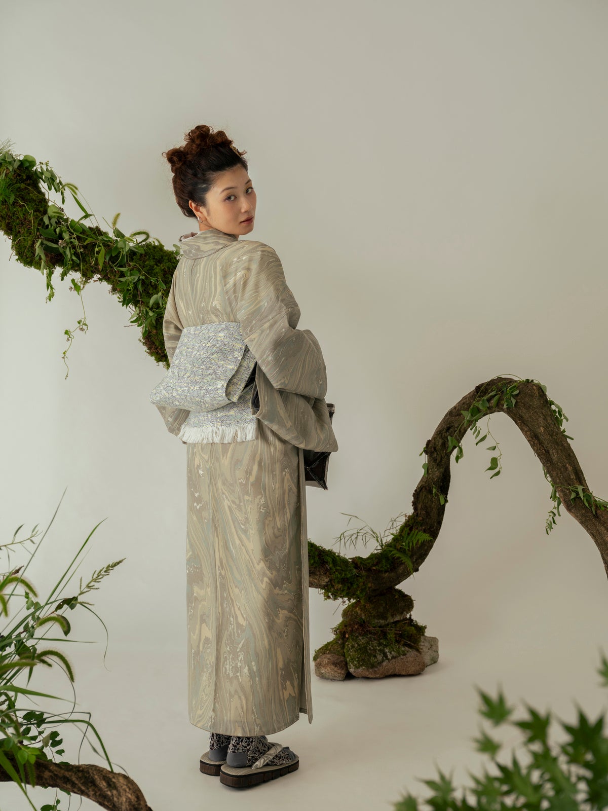 自然の移ろいと樹木の温もりを、ARCHを象徴する「墨流し」で表現したきもの。