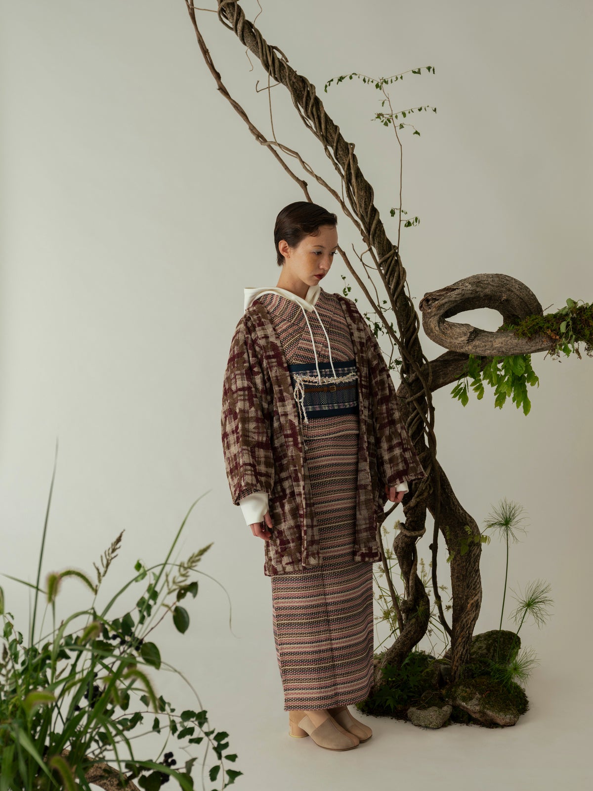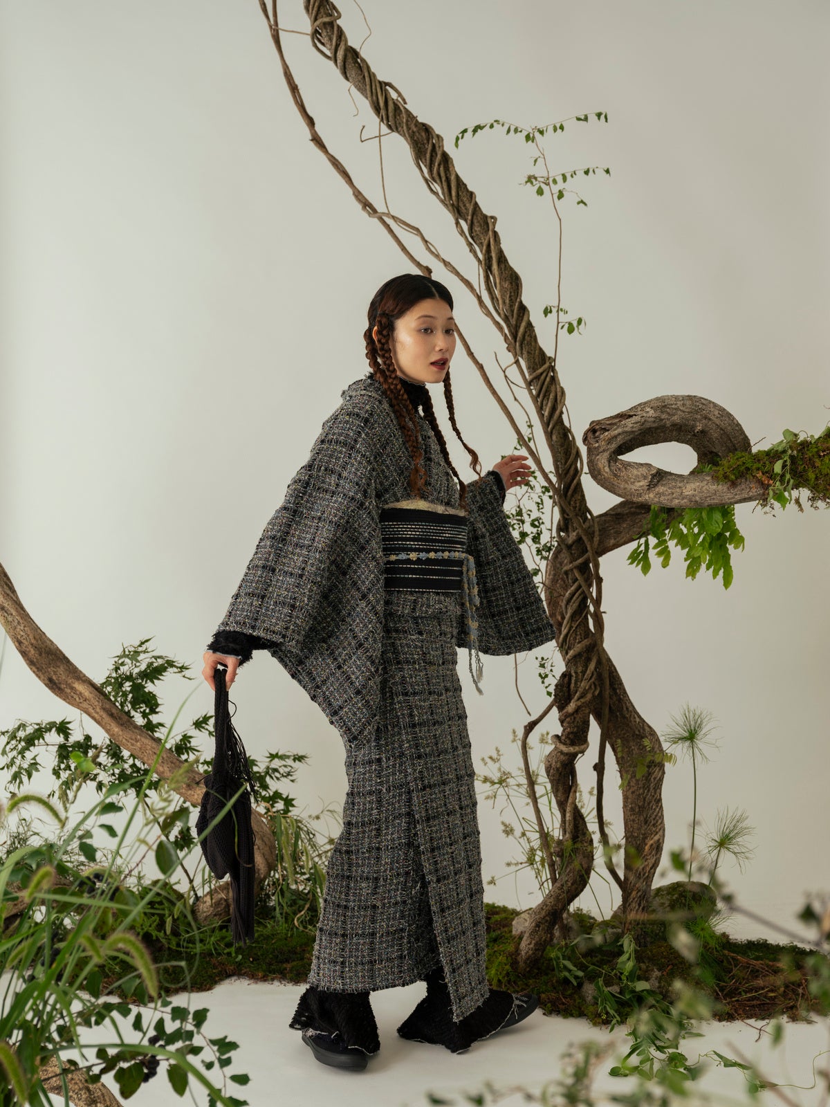世界各国のメゾンブランドが訪れる、その土地に根付いた生地づくりの“さんち(産地)”が、日本にはあります。今コレクションでは、フォーマルシーンのスーツやジャケットにも使われるツイードやウール生地を中心に、糸の魅力と手しごとの温もりを掛け合わせたきものを展開します。
