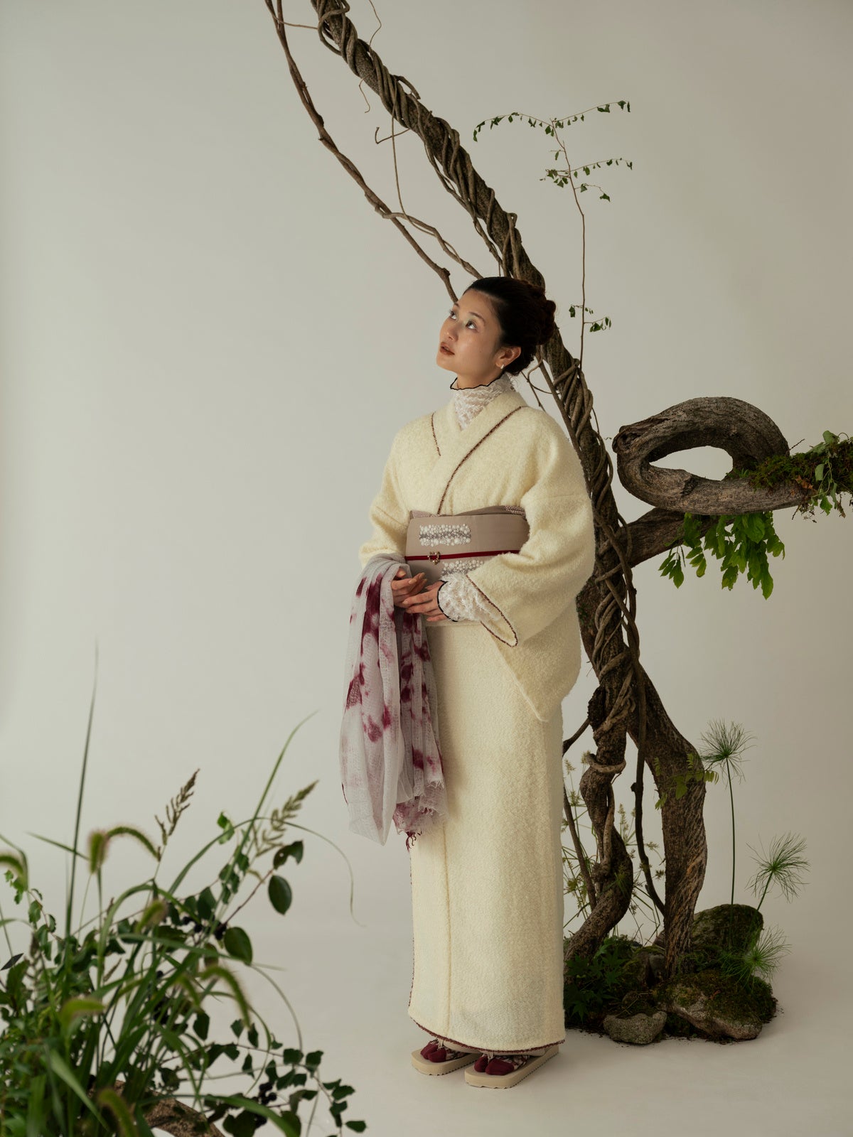 現在では、手しごとの風合いを大切にしたツイードの一種として発展し、日本でも岩手や山形など、羊の飼育が盛んな土地に根づいた産業として受け継がれています。ARCHが大切にする“その土地ならではの手しごと”の魅力に光を当て、世界を見渡す視点を一枚のきものに宿しています。