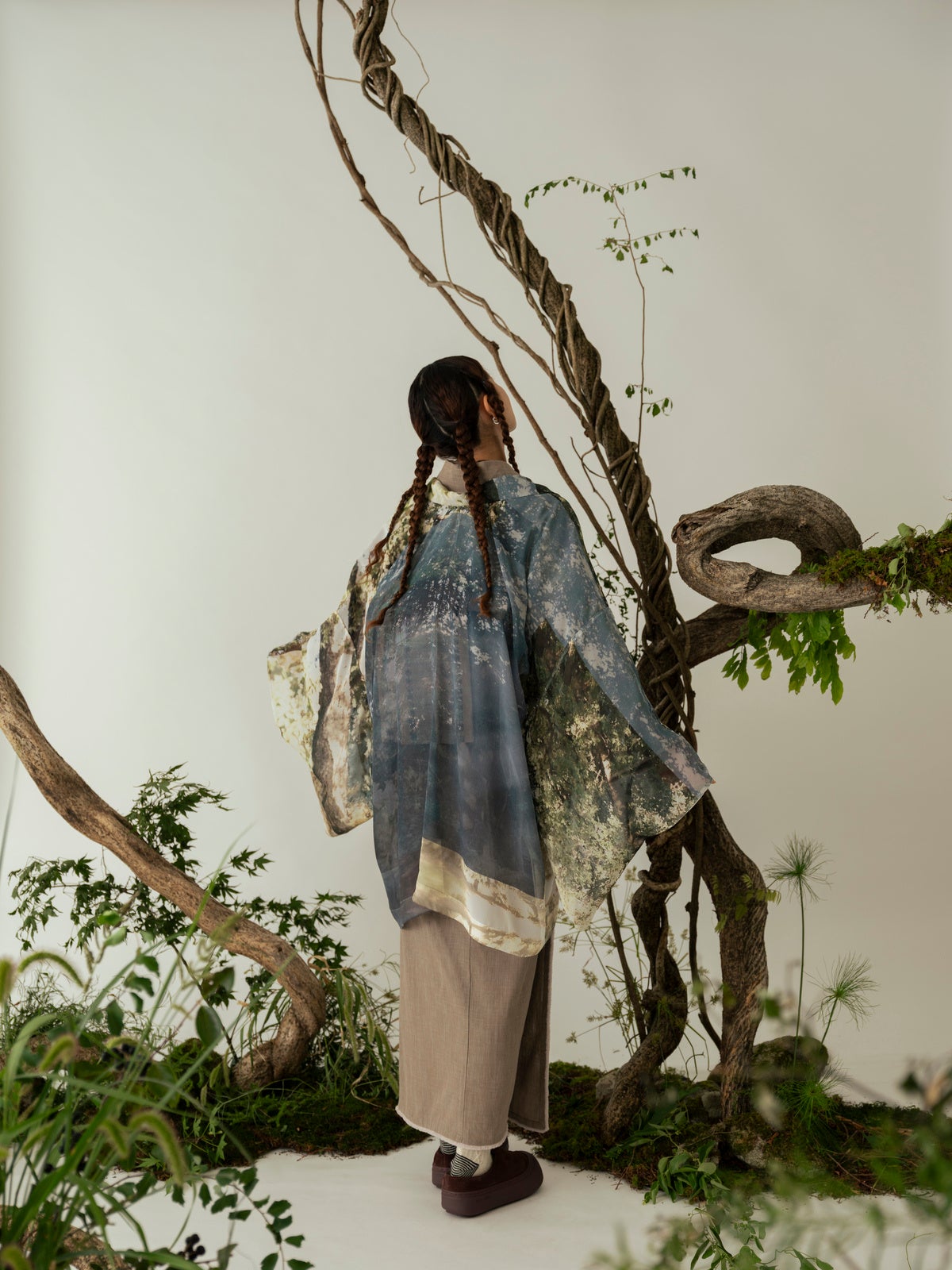 ずっしりとした木の安心感、水の恵みや風の音、木漏れ日の柔らかさ--今シーズンのテーマを象徴する羽織。ARCHのフォトグラファーである小財美香子氏が、日常で何気なく撮りためてきた写真の中から、近くに有る穏やかさを思い返させてくれる写真を選びました。まるでその風景の中にいるような、風をまとう感覚を与えてくれる透け感のある素材を合わせています。着ているときの心地よさはもちろん、街中でもいつでも穏やかな空気をまとわせてくれる、趣のある一枚です。