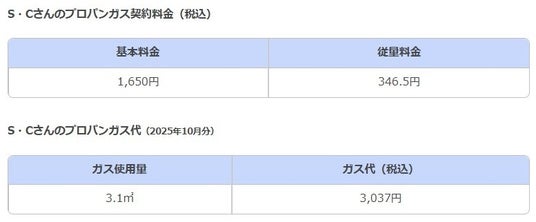 千葉県の大手プロパンガス会社と契約しており、料金にも満足しているS・Cさんのプロパンガス料金は以下のとおりです。