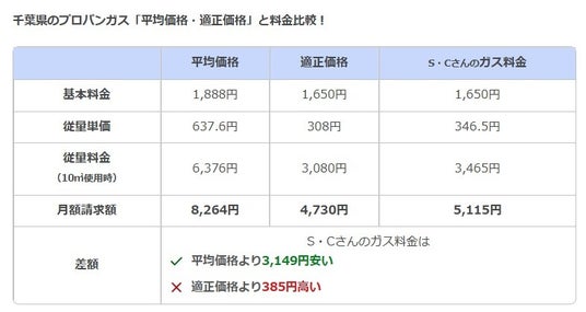 そこで、同様に、S・Cさんのプロパンガス料金についても、千葉県のプロパンガスの平均価格・適正価格*とそれぞれの料金を比較してみました。