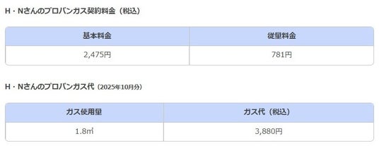 実際に、H・Nさんのプロパンガスの「基本料金」が2,475円であるのに対し、S・Cさんは1,650円。「従量料金」単価は、H・Nさんの781円に対して、S・Cさんは346.5円と、H・Nさんの約2倍近くも安くなっています。