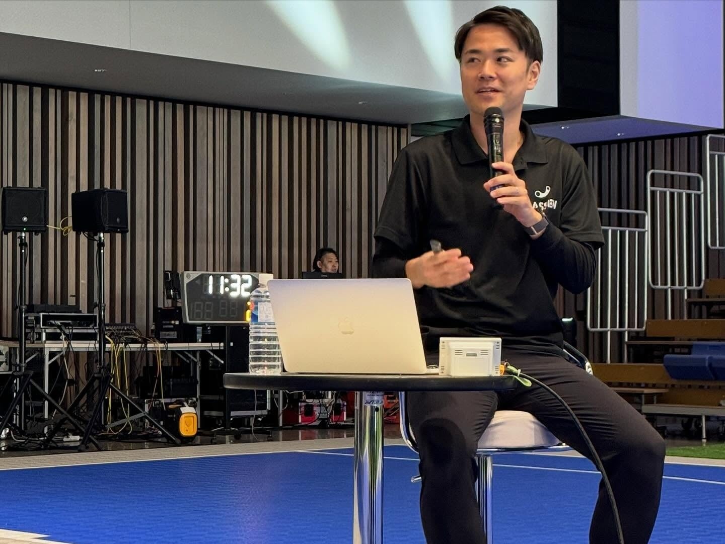 さらに、初日には会長の本村隆馬がステージ登壇し、「護身術から護進スポーツへ ~アイデア着想から事業化まで~」をテーマに、SASSENの開発ストーリーとビジネス化に至るまでの経緯について講演を行いました。
