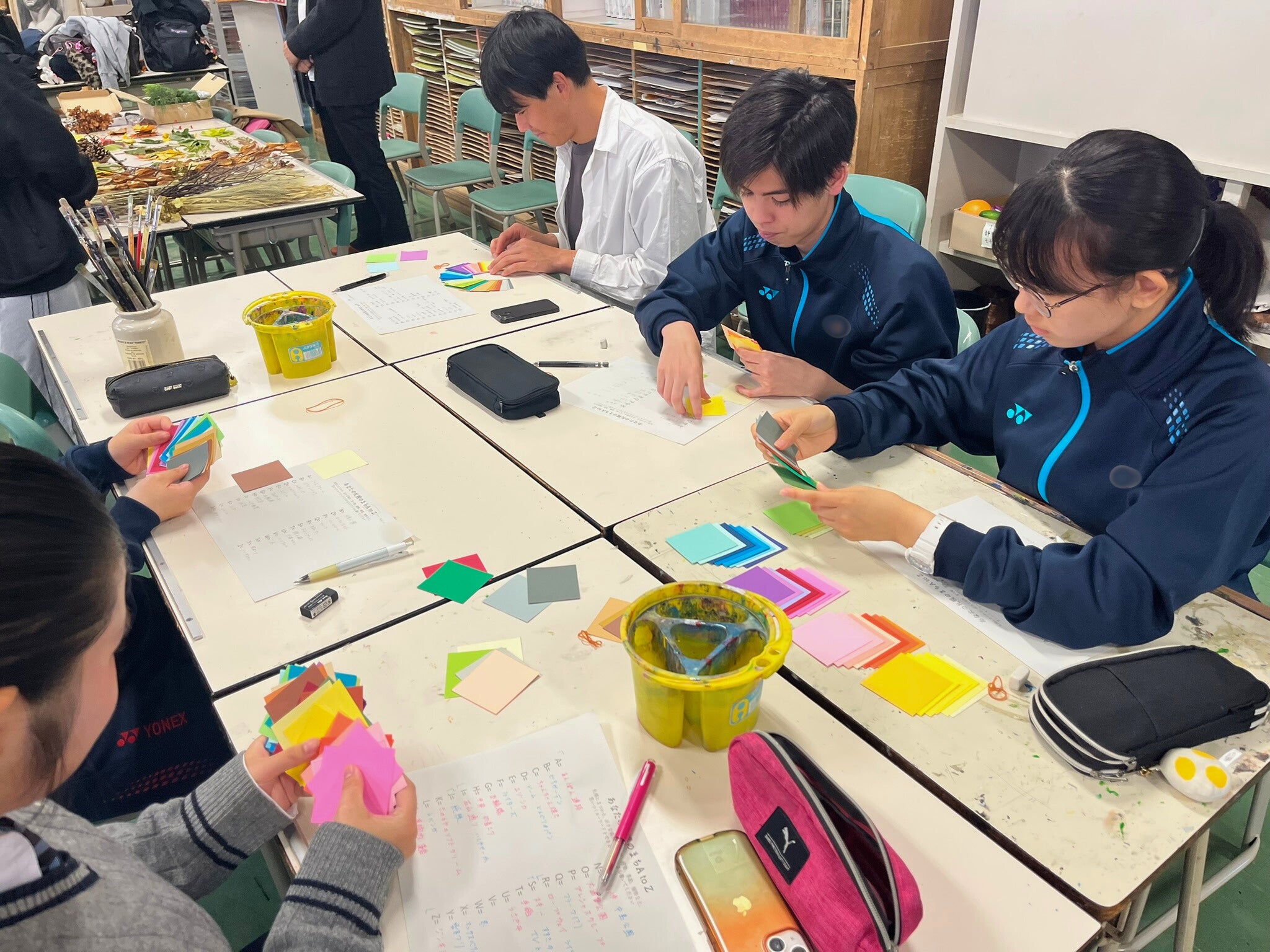 アートの制作に入る前には、インスピレーションを豊かにするための発想ワークを実施しました。生徒たちはA~Zのキーワードに沿って、景色や建物、人、食べ物、言葉など、札幌の魅力を自由に挙げ、”自分たちのまち・札幌” がもつ多彩な魅力を再発見しました。さらに、挙げたキーワードごとに、48色のカラーカードの中から連想する6~8色を選び出し、アート制作に向けた色彩のイメージを膨らませました。