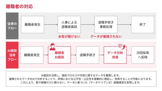 これらのアンケートにおける課題を克服し、データに基づいた組織改善を実現するためには、離職対応プロセスへのAI面談の活用が有効と考えられます。