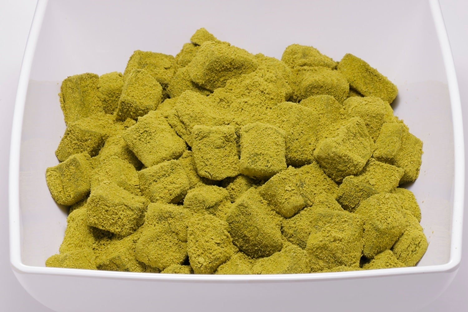 わらび餅に抹茶をたっぷりと絡めました。抹茶のほろ苦さと黒蜜の甘さがくせになる味わいです。