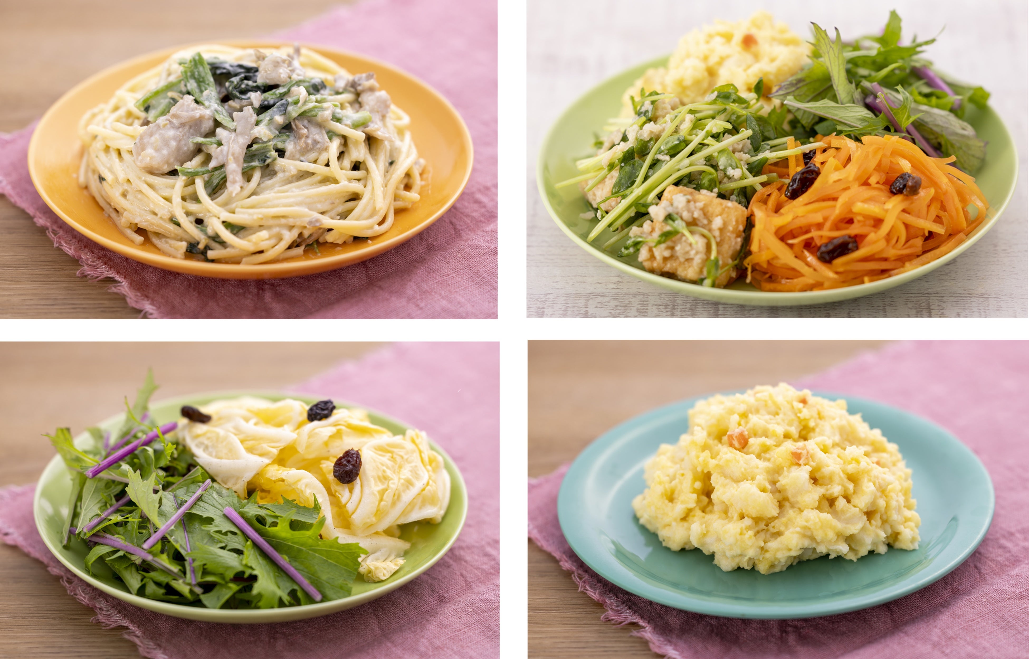 甘みがあるオレンジ白菜はオリーブオイルと塩胡椒でシンプルな味わいにし、アクセントにレーズンを加えました。※国産野菜を使用