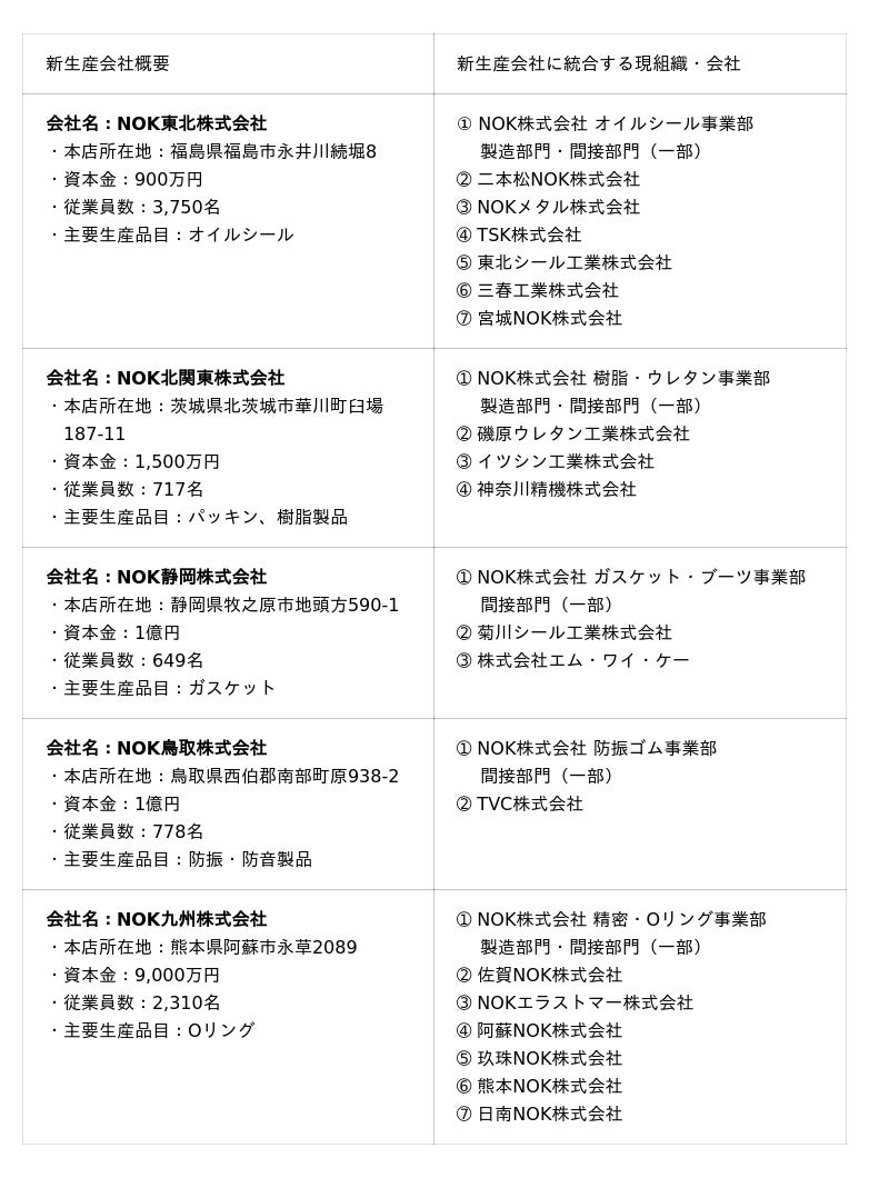 NOK株式会社(本社:東京都港区芝大門、代表取締役 社長執行役員 グループCEO:鶴 正雄、以下「NOK」)は、日本国内の生産拠点を再編し、新たに生産会社5社を2026年4月1日付で設立いたします。経営資源の最適運用と生産体制の強化により、グローバルでの競争力向上と持続的な事業成長を目指します。