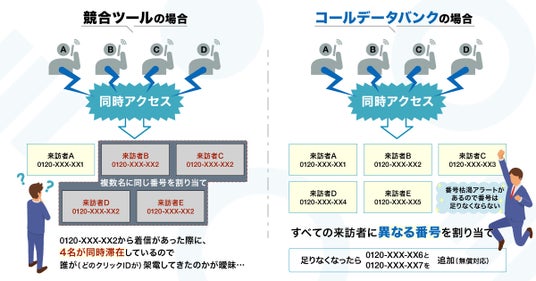 一方、他社ツールでは「アクセス数の平均値から必要番号数を推定する」というロジックを用いており、この方法では実際のアクセス状況との乖離が生じやすく、計測用電話番号が不足するリスクがあります。