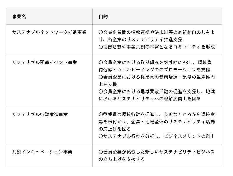 初期活動は、ネットワーキングに重点を置きます。あわせて、従業員向けの健康やサステナビリティ意識を向上させるプログラム、地域貢献、対外的なPRの機会も設ける方針です。