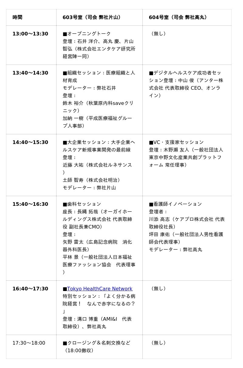 本企画は、中野区役所6階(603・604号室)にて13時00分より開始し、医療・介護・福祉、スタートアップ、デジタルヘルス、投資、病院経営など多様な領域を扱う専門セッションを展開いたします。